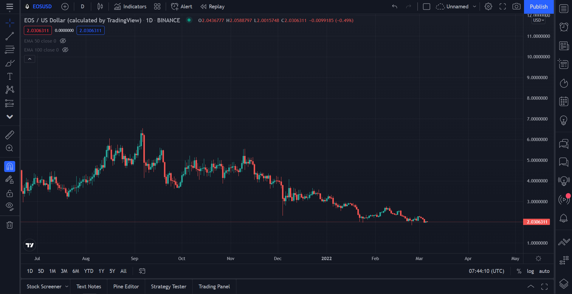 EOS current price on March 6, 2022erev (60)in #eos • 4 years ago The price of EOS today is at the level of $2.03 #cryptocurrency #currentprice #tradingview