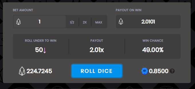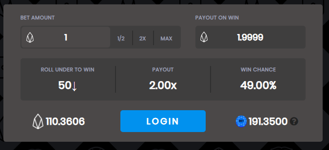 On the right you'll see your current amount of EOS on your logged in account. On the right side you can see the amount of BET tokens you have. Currently there is an airdrop going that for every 5 EOS bet, you'll receive 1 BET token. BET tokens are dividend tokens. 100% of the house profit (yes, that's EOS) will be shared weekly to all BET holders. In the middle you should see the "login" button has been replaced with the "ROLL DICE" button.