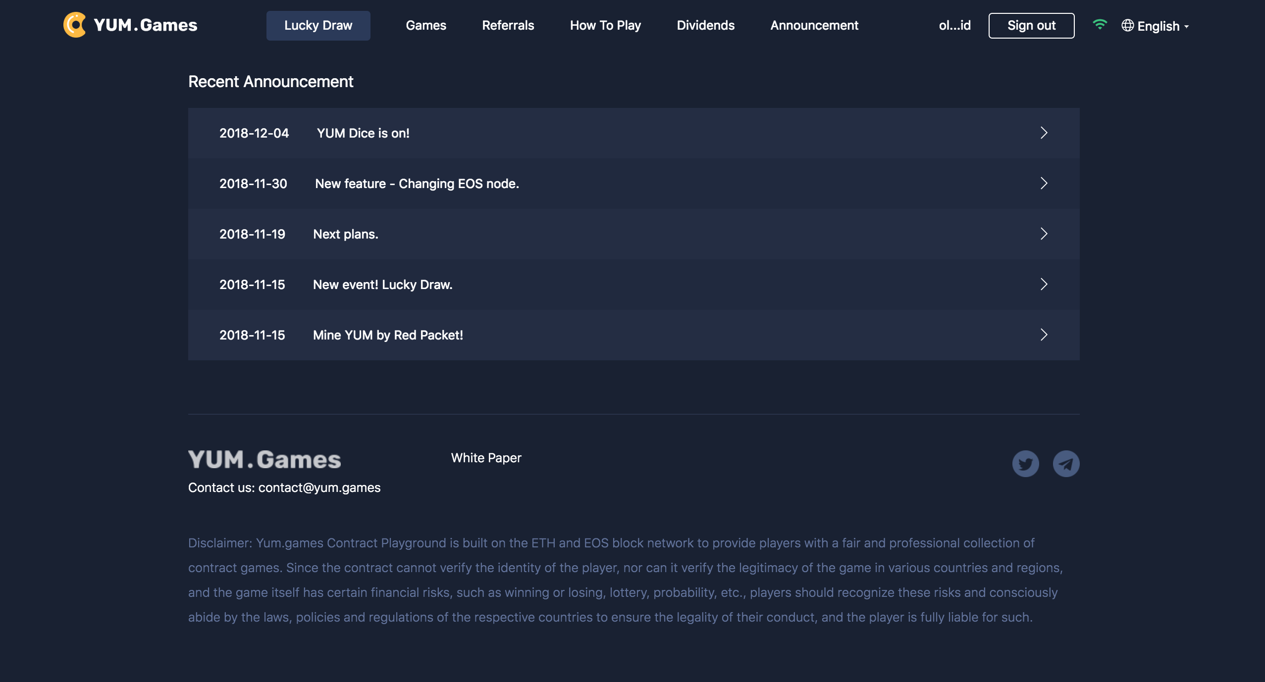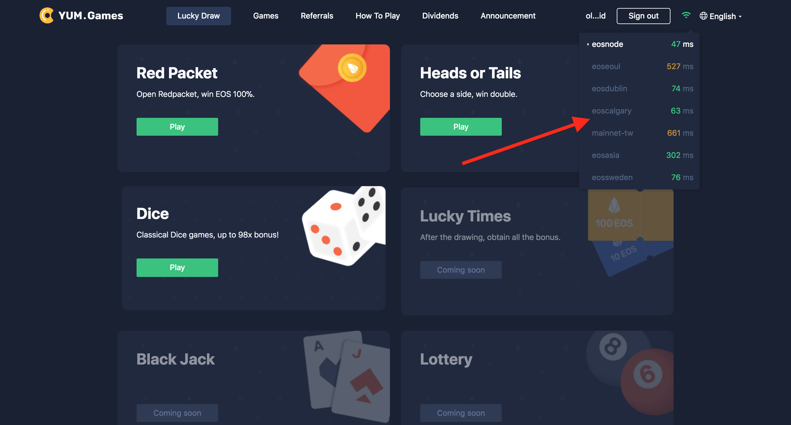 There is another small new feature called Changing EOS node. Now, you can click on the "WI-FI" icon upper right corner at the top of the Yum.games website to choose a faster node of your location. Below is the corresponding screenshot.
