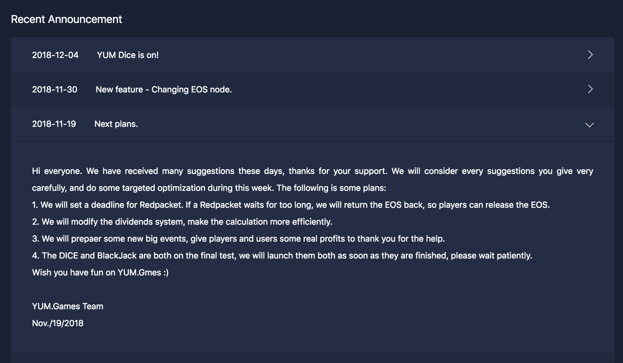 - Yum.games will set a deadline for Red Packet. If a Red Packet waits for too long, they will return the EOS back, so players can release the EOS.