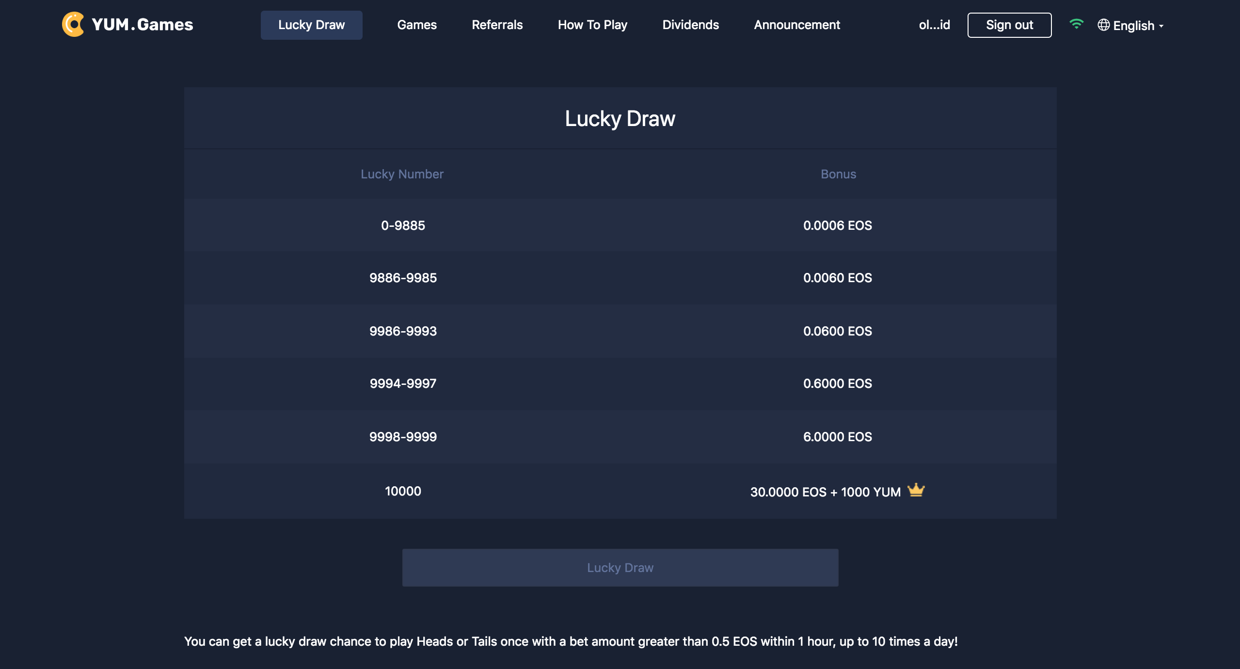 Without much excitement Yum.games introduced Lucky Draw. You can get a lucky draw chance if you play once with a bet amount greater than 0.5 EOS within 1 hour, up to 10 times a day. Below is the corresponding screenshot.