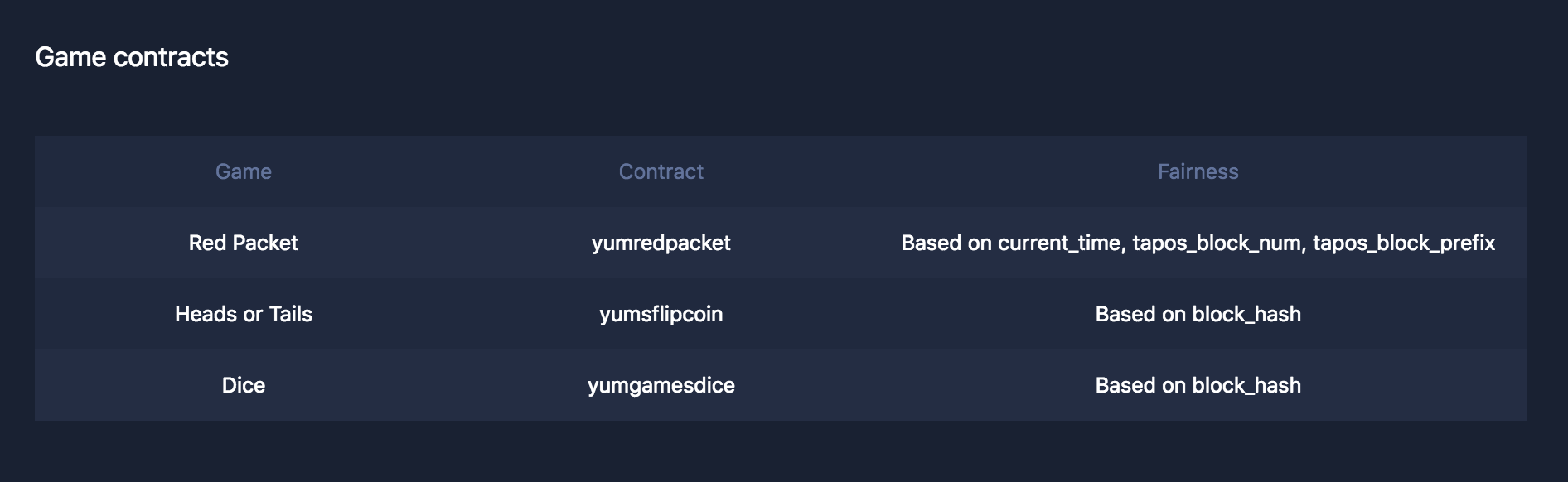 In the following I list the game contracts of Yum.games: