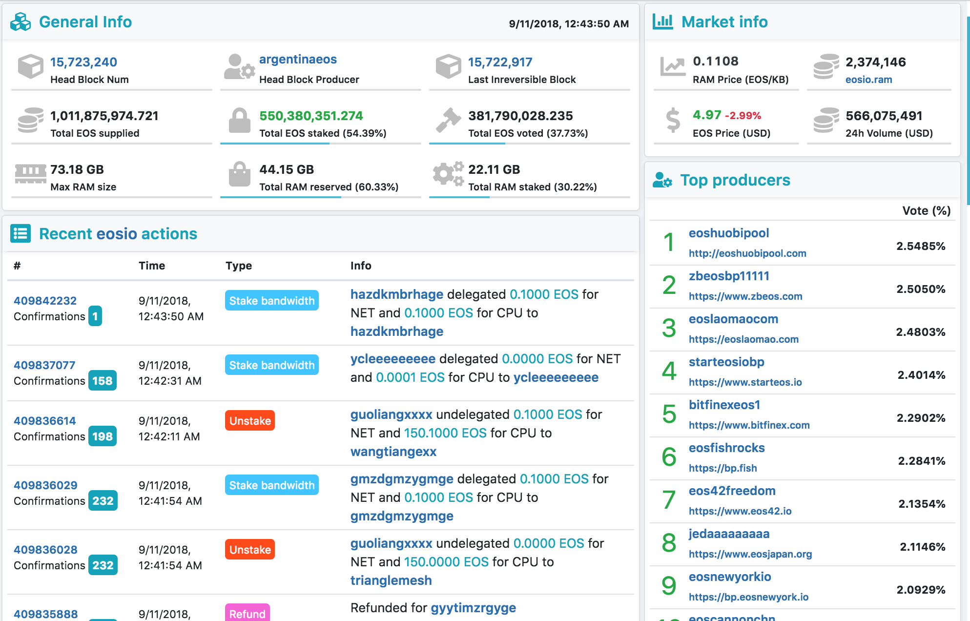 - Dashboard : General blockchain info, market info, recent eosio actions, top producers,...