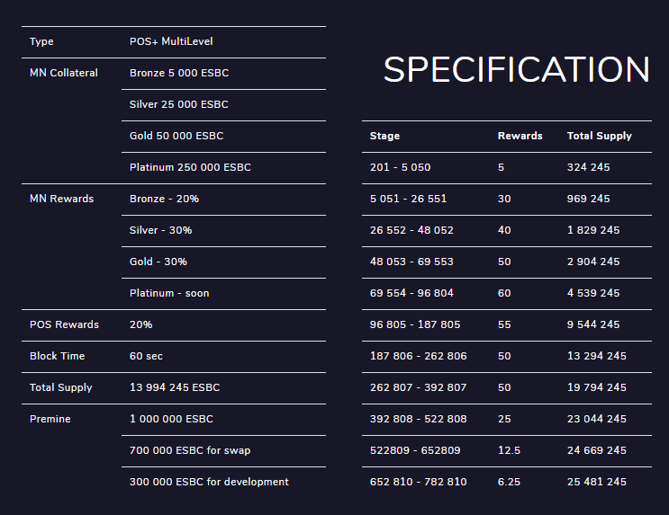 Besides that, and thanks to the technology used (Blockchain) ESBC also offers a variety of 4 tiers of MNs, of which anyone willing to invest in the project, can achieve a long-term gain with high recovery rates … The MNs of ESBC are intelligently designed, to achieve an effective return on investment, and maintain harmony between the time lapse and the subsequent investments … You can check it for urself whatching the next table: