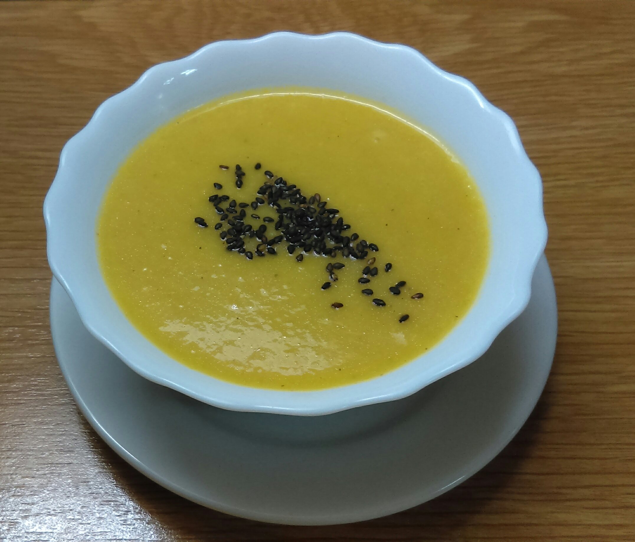 tambahkan margarin, garam, dan terakhir merica bubuk, untuk tampil cantik tambahkan wijen hitam diatasnya kuah labu kuning yang sudah di tuang di mangkok, taburkan lalu hidangkan, kuah labu kuning siap dinikmati.