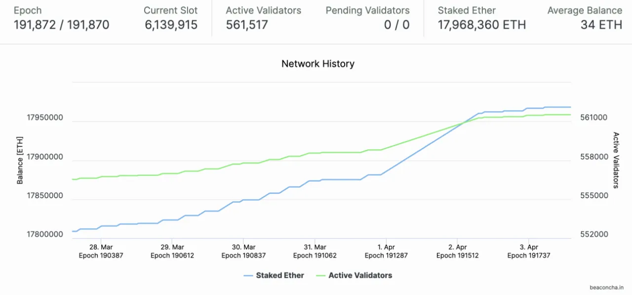 Since the launch of the Beacon Chain in December 2020, users interested in becoming validators on the Beacon Chain have been staking a certain amount of ETH on Ethereum to receive rewards. Staking is a one-way process in which users lock up cryptos to support the network and validate transactions and earn passive income. According to beaconcha.in, as of April 4, over 17 million ETH (worth about $32.8 billion) has been staked on the Beacon Chain.