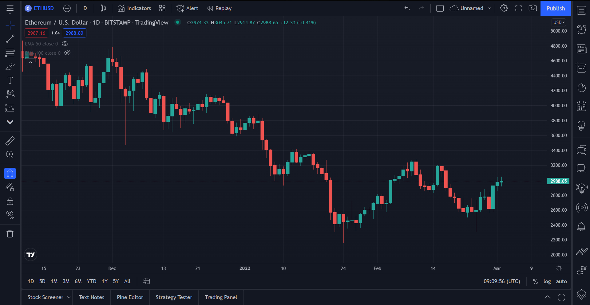 ETH current price on March 2, 2022erev (60)in #eth • 4 years ago The price of ETH on March 2, 2022, is $2988.65 #cryptocurrency #currentprice #tradingview