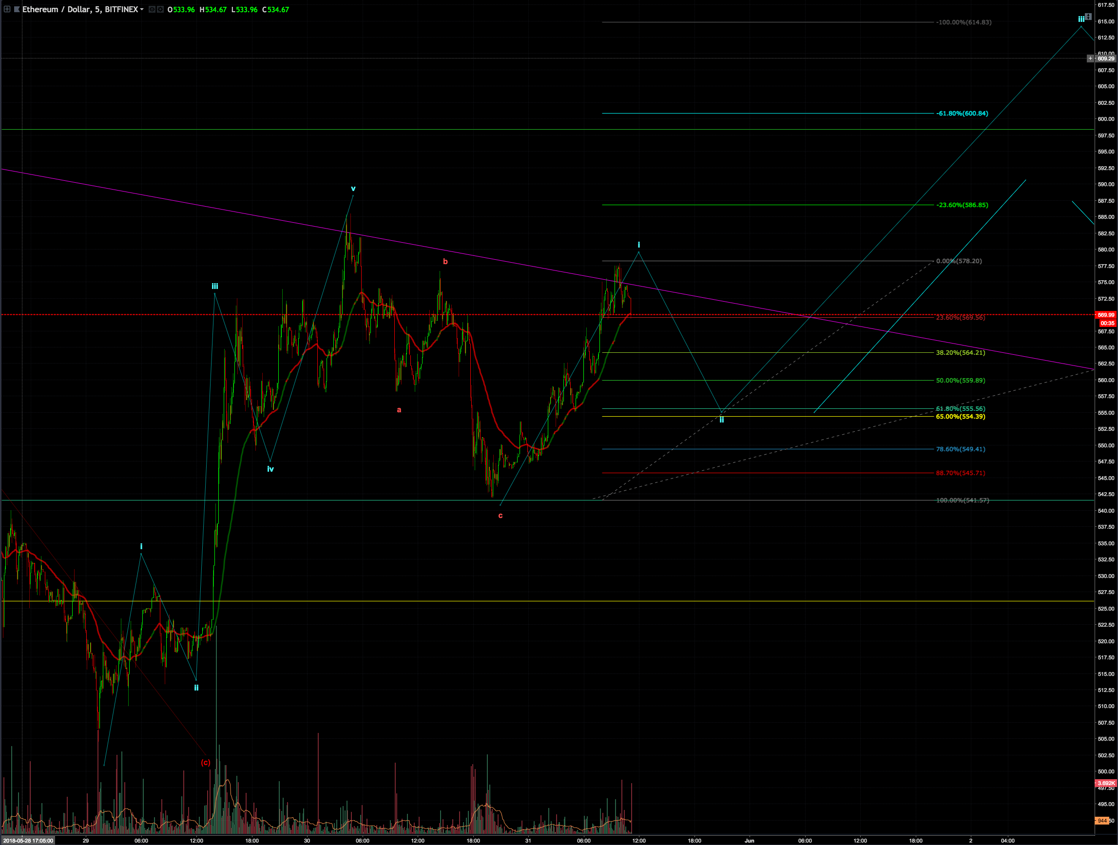 I expect from here an ABC correction. Statistically the 2th reactive wave should retrace at 0.618 Fibo level before the 3th wave. This is my target (555$) for now. This target should be reached in 8 to 10 hours from now. The 3th wave must be the strongest and never the shortest so I expect this wave to break out the first downtrend line (pink line down). If 3th wave reach 1.618 Fibo extension then the 5th has a very good chance to reach the 2.618 Fibo extension . If the 3th wave reach 1 Fibo extension most likely the 5th wave stop at the second downtrend line (ping line up).