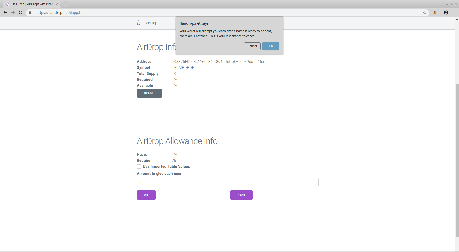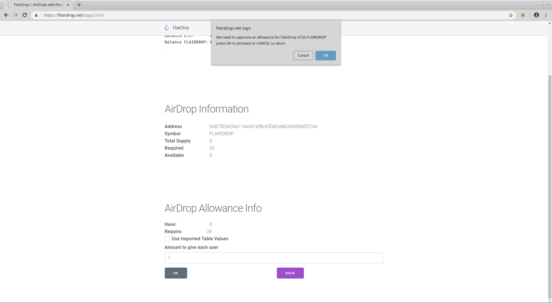 Step 7: When I did this there were only 26 unique accounts participating in SPRIZE, so I only needed 26 FlairDrop. This screen is letting me know the tool is about to configure an allowance. An allowance is used to give the contract access to funds instead of performing a transfer of funds to the contract. This was a design choice because if something went wrong it would be difficult for the user to get funds back if we used transfers. That way if anything doesn't work, the user can just cancel the allowance, meaning there's no chance that funds can get lost!