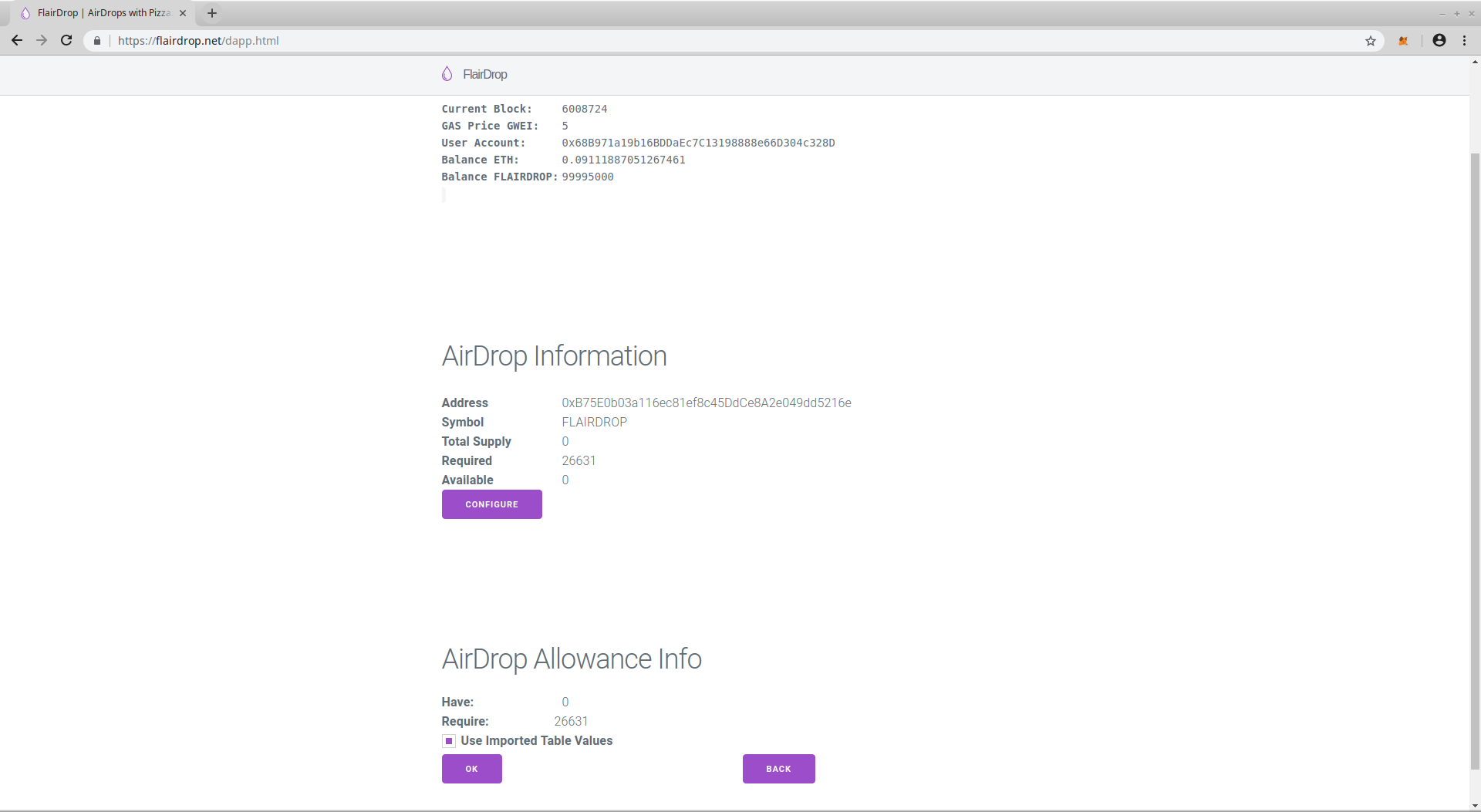 Step 4: The next step is to configure your settings, as you can see a 1:1 matching airdrop would require 26631 of the tokens being airdropped. In this case I am actually dropping FlairDrop and it accurately reflects I have none available, so I had to buy some, by sending a little money to the FlairDrop contract address. 0.0001 ETH each account you want to send to, but you can send as much of the token being airdropped as you want.