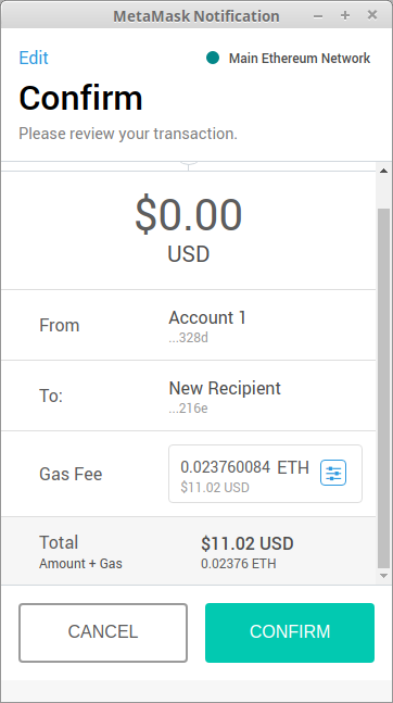 Step 8: The next screen shows MetaMask confirming the action. You can see that I'm about to spend $0.08 USD, this isn't the send yet. It is the act of provisioning an allowance for the contract to use in order handle the airdrop.