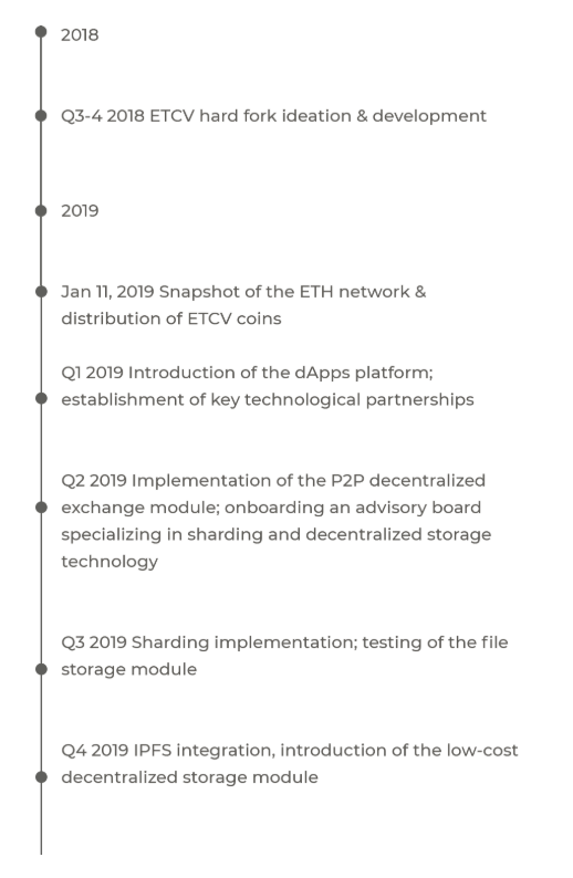 Token dari ETCV akan dibagikan secara gratis di kalangan pemilik ETH 11 Januari 2019. Selama beberapa bulan ke depan, ETCV akan dimasukkan dalam jumlah pertukaran cryptocurrency besar (saat ini tim proyek sedang bernegosiasi dengan beberapa dari mereka) dan akan diluncurkan dalam lingkungan pengembangan dApp , di mana startup blockchain akan dapat membuat dan menggunakan layanan baru, menambahkan aset mereka ke membuat pertukaran P2P - Vision DEX .
