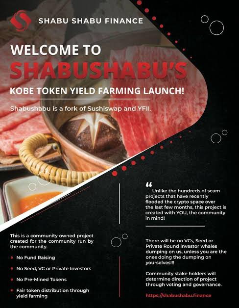 Shabu Shabu Finance is a trustless decentralized exchange platform, for swapping cryptocurrencies from the smallest to the biggest volume possibly imagined, all done with the best security measures put in place. Shabushabu is a fork of Sushiswap and YFII.