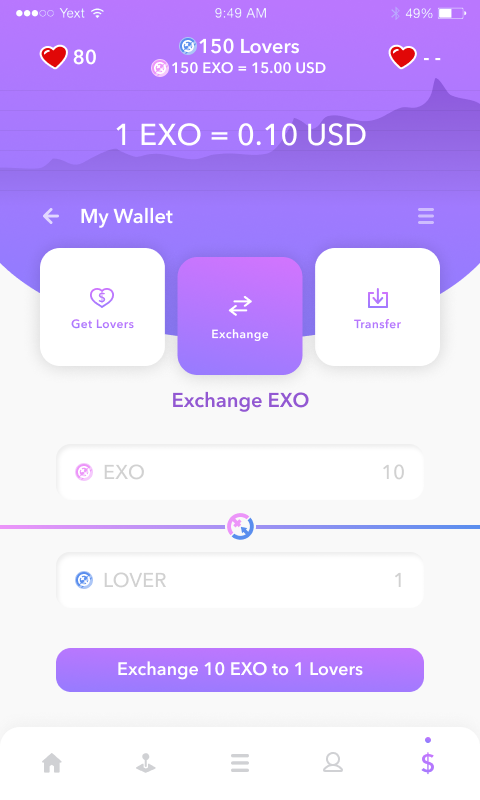 To make ExoLover possible, two ‘tokens’ or settlement systems are used. The first token; “EXO” is the project's cryptocurrency that is built on the Ethereum blockchain. This is a global token that is freely tradeable and exchangeable for real money/fiat. The second token is “LOVER” which is an internal, stable token of the project. The intention of this token is that is easily bought/used within the platform and each token will always be equal to one US Dollar regardless of the value of EXO tokens, Ethereum, Bitcoin or any other cryptocurrency.