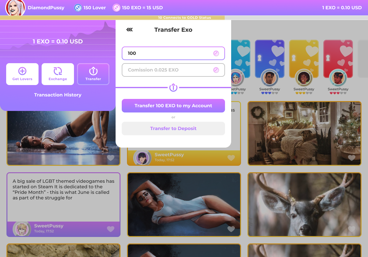 Every time you connect with another user or watch pornographic content on the Solo mode, the "Reward Fund" is launched. This means that one of the users currently in the connection can win up to 150% of the amount spent on the connection. The choice of the lucky user is selected randomly using custom coded algorithms. The reward is paid in EXO tokens which are credited to the user's account. These EXO tokens can then be exchanged for LOVER tokens or they can be withdrawn and used at his/her own discretion.