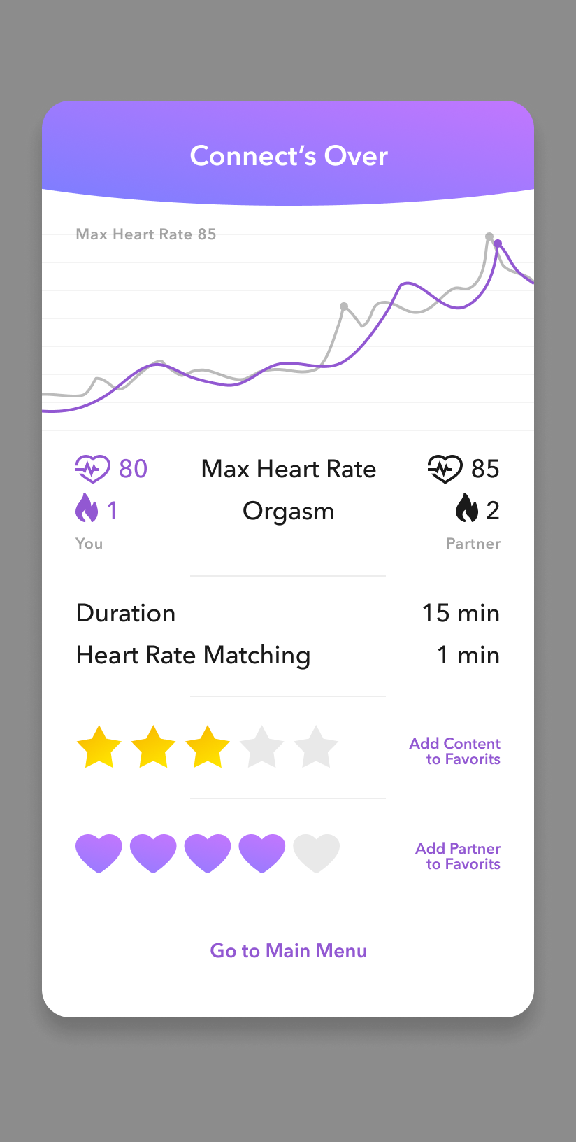 During the session, all devices connected to the mobile application synchronously reproduce everything that happens on the screen of your smartphones with a partner. If your partner has an ExoBeat device, then you can see how their heart races and slows, and if this device is also dressed on your wrist, then you can also feel the heartbeat of your partner. And at the end of your sexual adventure, you can even see how your heart beats synchronise...