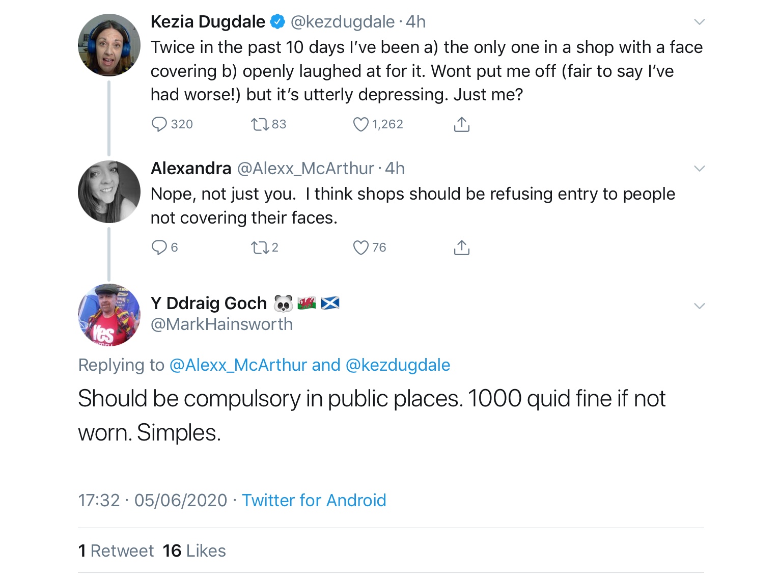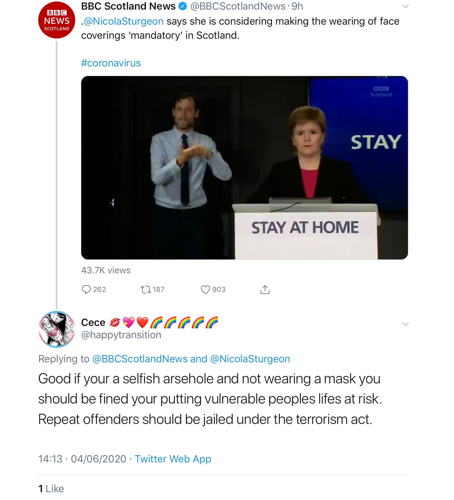 Except those that don’t agree with the mob and don’t think like them. To which the response is to hope they die of the ‘consequences’ of not wearing a mask and, for a bonus treat, be denied medical treatment related to COVID-19 at any NHS Hospital. The same institution we’re all told to be loudly thankful for (We’ll be even louder if they actually live up to “inclusivity” and stand up to anyone who says someone they disagree with should be denied their basic right to treatment).