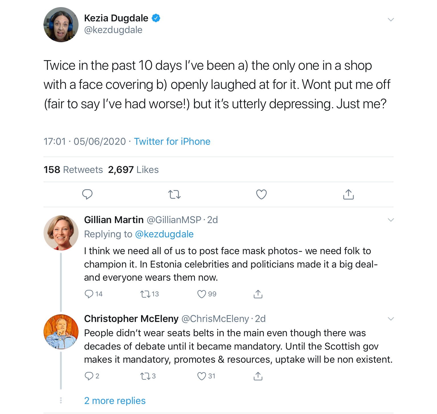 Link to news article on SNP MSP suggesting that non face mask users be stared at. https://www.heraldscotland.com/news/18493718.coronavirus-snp-minister-suggests-staring-shoppers-without-face-masks/