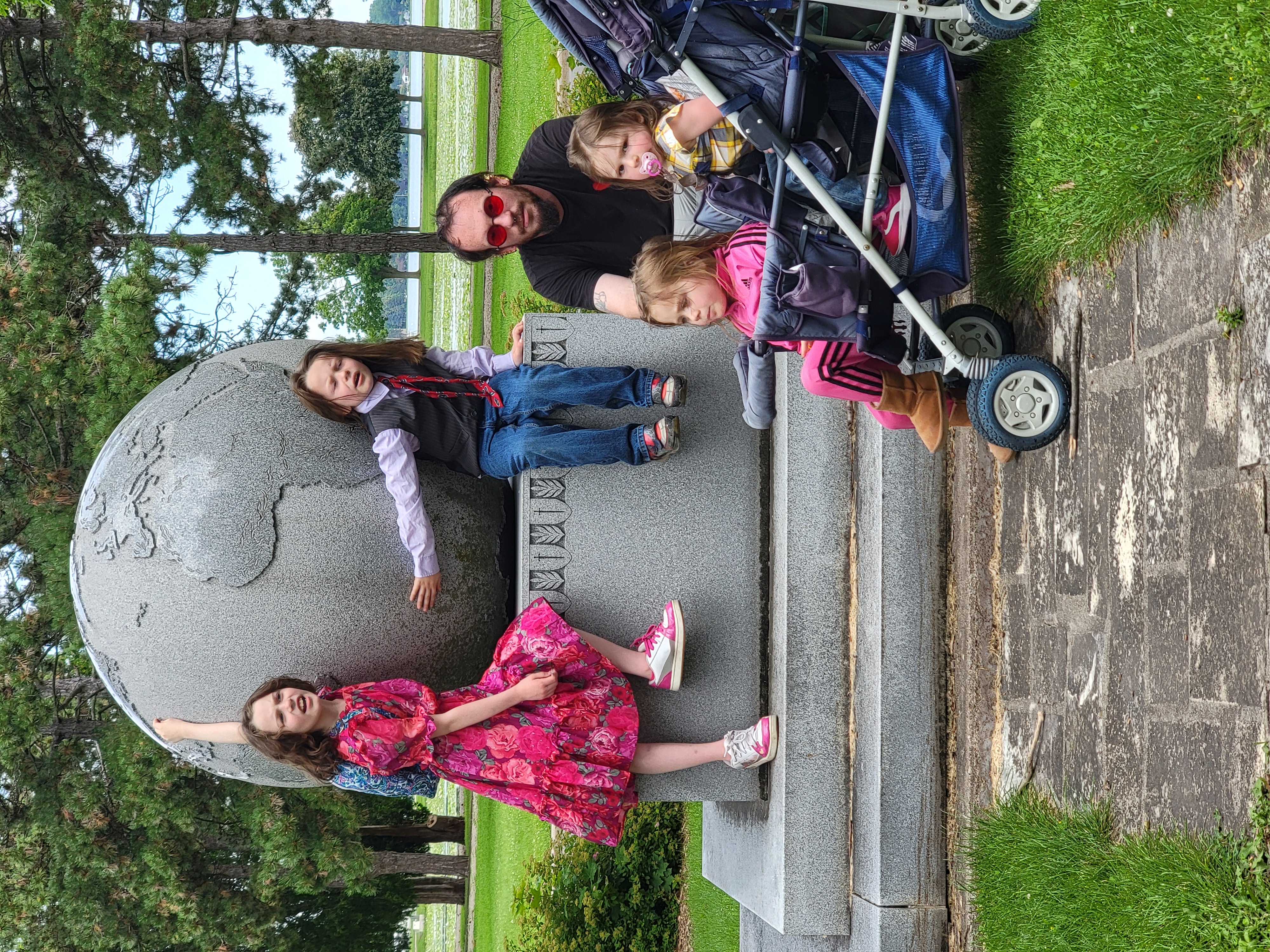 (https://steemit.com/@issabelleharvey on the left in the pink dress, my son Ajax in the tie holding the earth up, Scarlett in the pink jumpsuit, Vellamo in the yellow and blue plaid, and my husband Chris in the red glasses. The baby was strapped to my chest, see the next photo to see baby.)