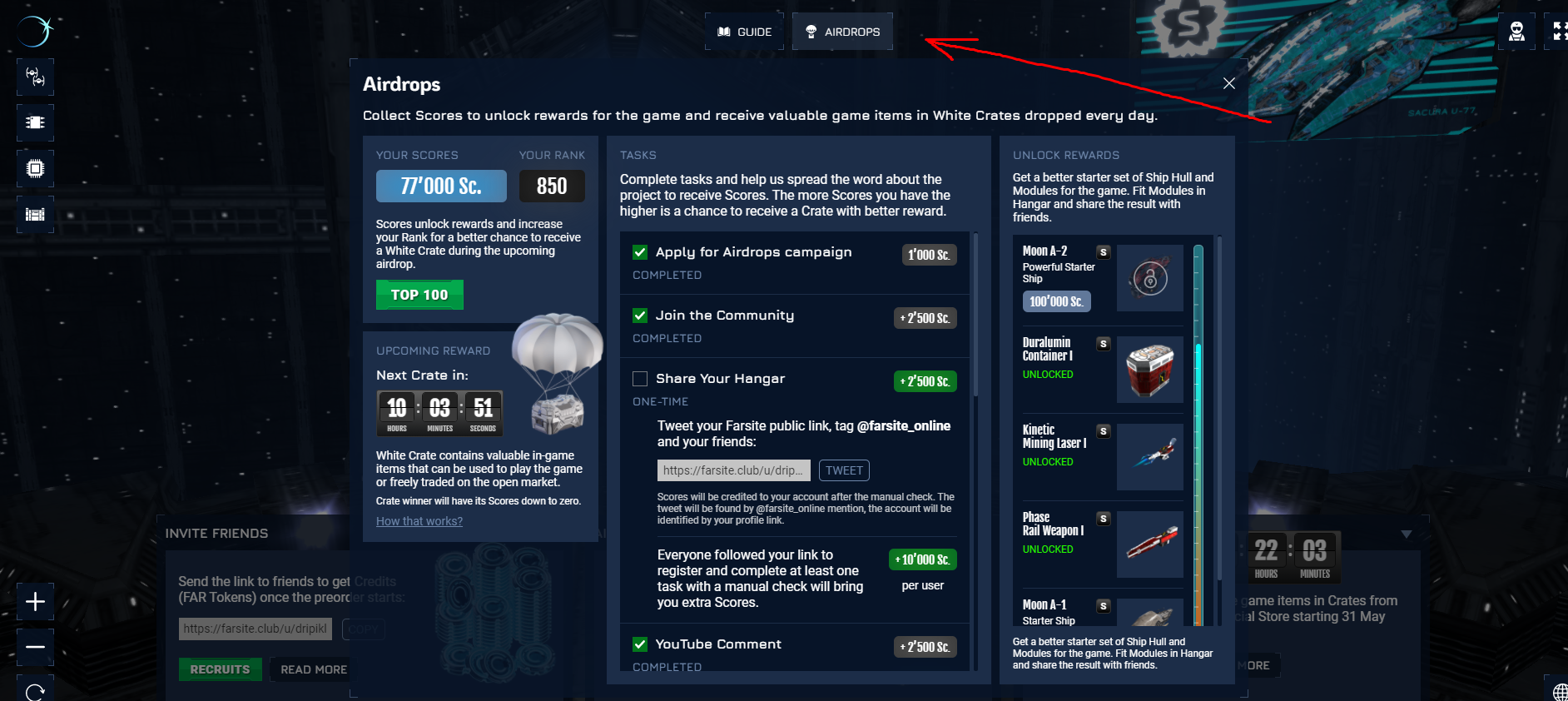 - После этого нажимаем на вкладку AIRDROPS и выполняем простейшие задания , такие , как подписка на телеграм канал , подписка на ютуб , сделать ретвит в твиттере и так далее . После того как вы выполните задания , то вы получите игровую волюту , с помощью которой вы сможете улучшить свой корабль и в дальнейшем можно будет торговать своими NFT предметами и таким образом можно хорошо заработать.
