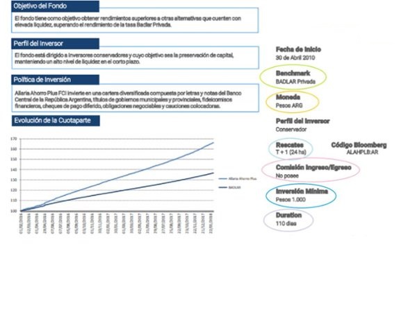 A tu izquierda vas encontrar información sobre el objetivo, perfil y política de inversión del fondo. El Objetivo nos indica que busca lograr el administrador, en este caso establece una tasa de referencia (BADLAR) y busca superar su rendimiento manteniendo una fuerte liquidez. En la mayoría de los casos los fondos establecen una tasa o índice de referencia, este se denomina “benchmark”. Es un sistema de comparación para saber si están trabajando bien, las tasas o índices seleccionada como “benchmark” tienen que ser de público conocimiento. El perfil nos muestra a qué tipo de inversor está dirigido el fondo. Este tema ya fue tratado en nuestro blog, y podes conocer más al respecto aquí. En la Política de inversión se aclara en que tipos de activos va invertir, y si busca focalizarse en un sector o tener un abanico más diversificado. Por último, el gráfico de evolución nos muestra cómo creció el valor de una cuotaparte a lo largo del tiempo en comparación con su tasa de referencia. La cuotaparte es la unidad de medida del fondo, uno puede comprar una o más cuotapartes.