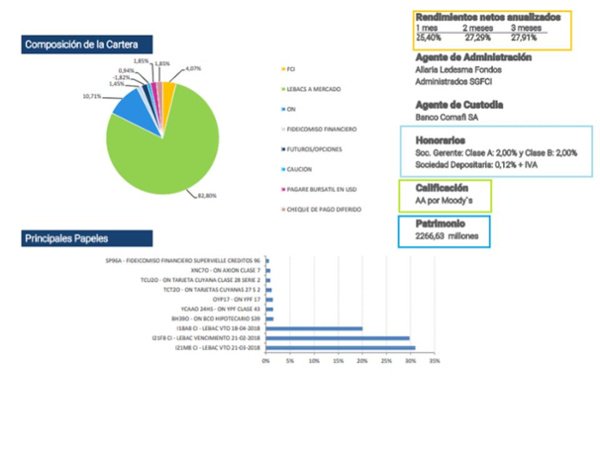 A tu izquierda, vas a encontrar dos gráficos ilustrativos sobre cómo está compuesta la cartera y cuáles son los principales activos que tiene. En el margen derecho, nos dan información sobre rendimientos, honorarios, calificación y patrimonio. Los rendimientos netos anualizados nos dicen cuanto es la ganancia anual del fondo libre de gastos; medida en el último mes, los últimos dos meses y los últimos 3 meses. En honorarios, se indica cuánto cobran la sociedad gerente y la sociedad depositaria por administrar el fondo. La calificación de riesgo en el caso de los fondos es opcional, en este caso tiene calificación y es muy buena. Esta medida nos da una idea de que tan riesgoso es el fondo. Por último figura el patrimonio del fondo, que nos dice cuanto hay invertido en el mismo.