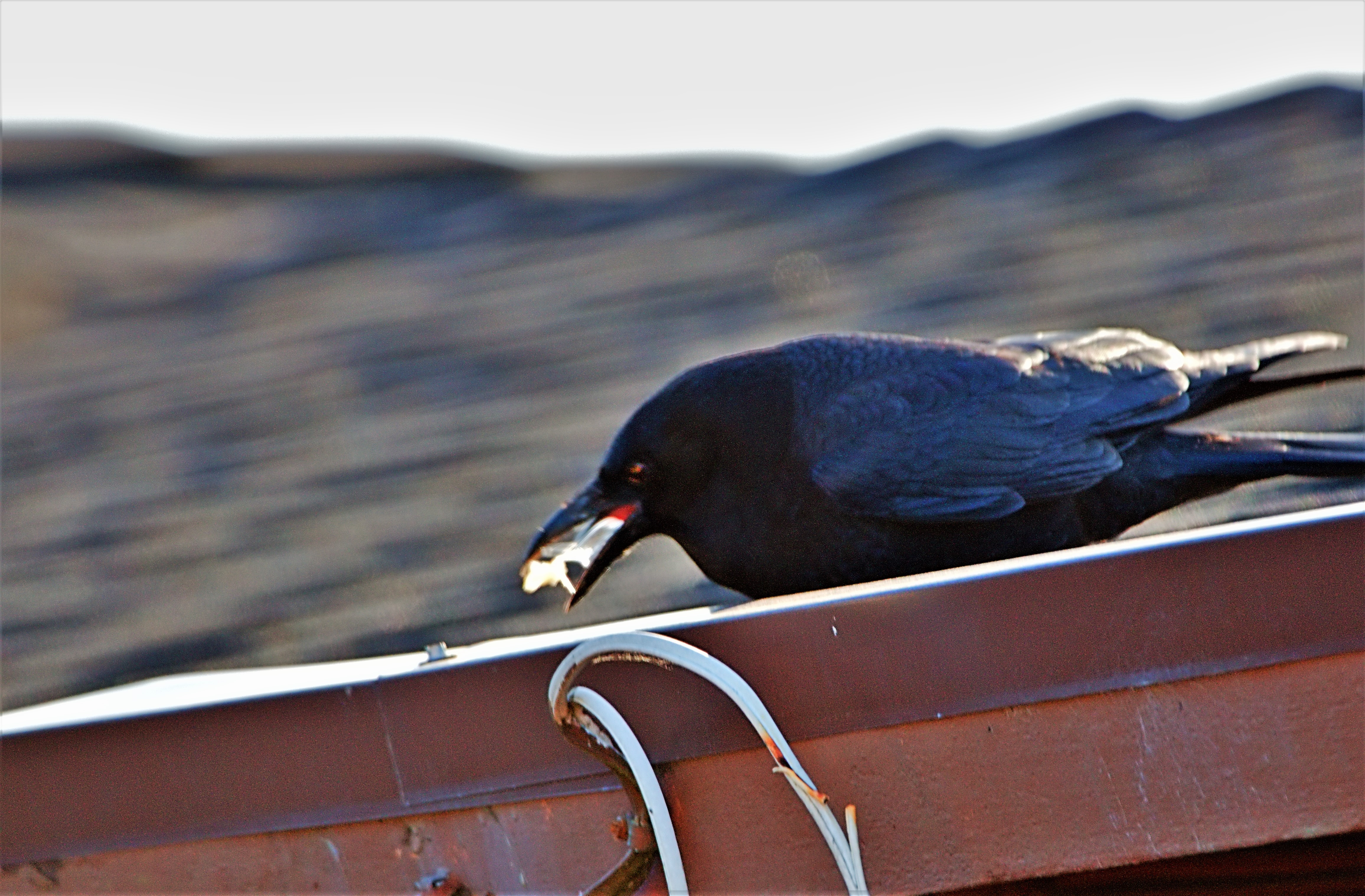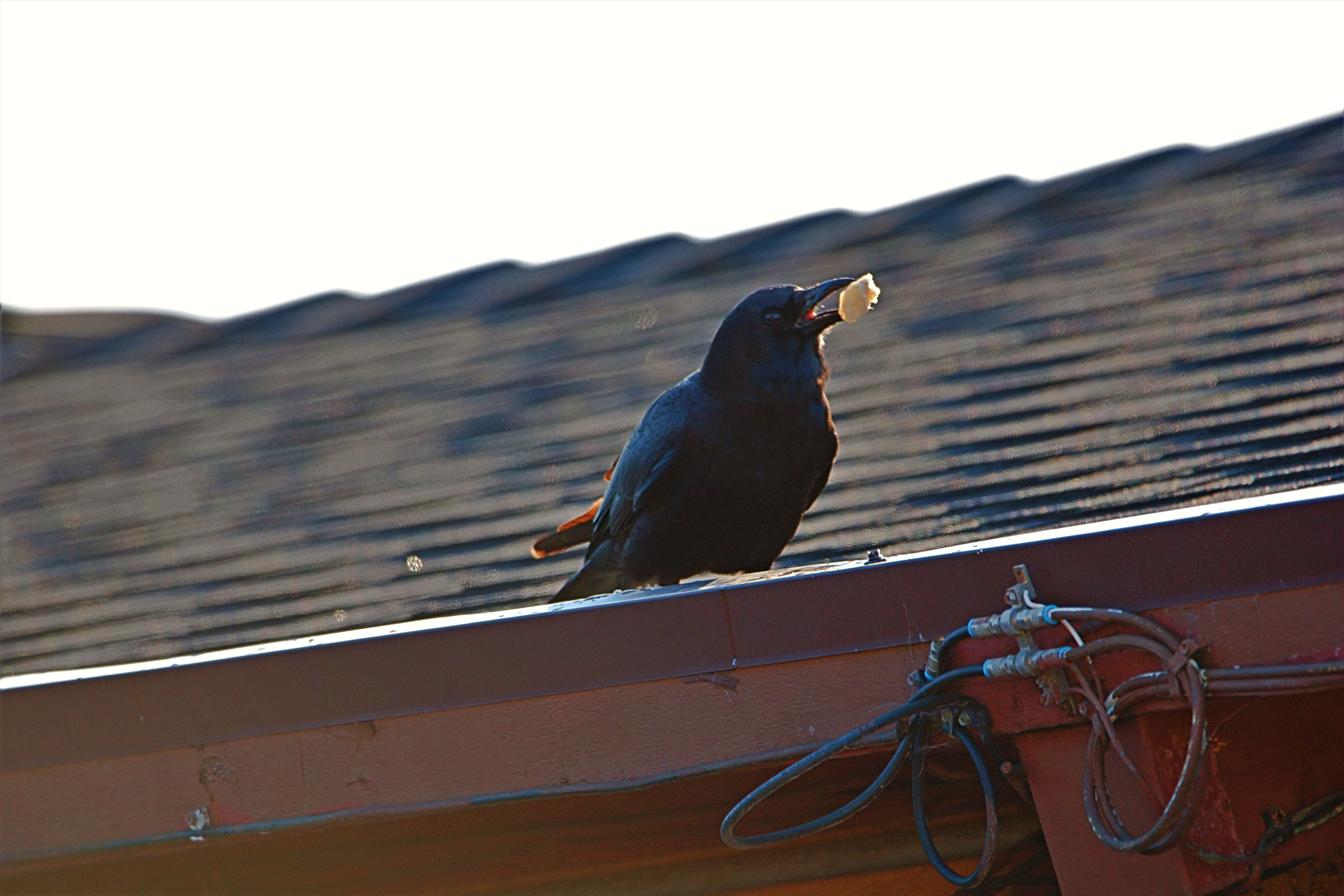 This crow flew in with a big piece of stale bread and dunked it in the standing water in the rain gutter to soften it up.