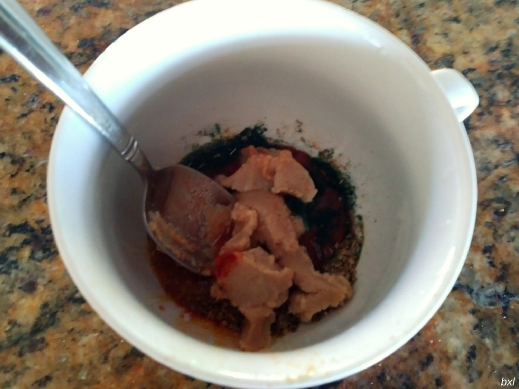 My miso soup is coming together and this is how I mix the spices and miso before pouring hot water over them. This is the cup I will drink out of which makes this a very easy way to make my soup and clean up later.