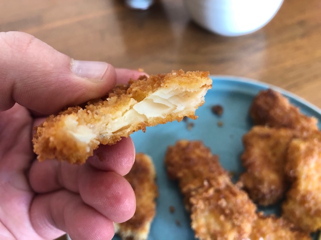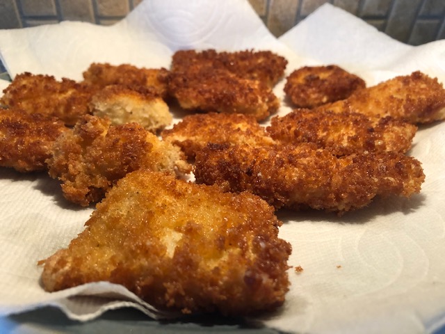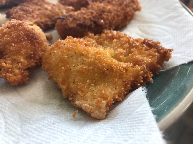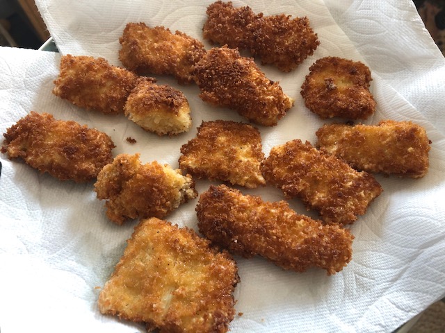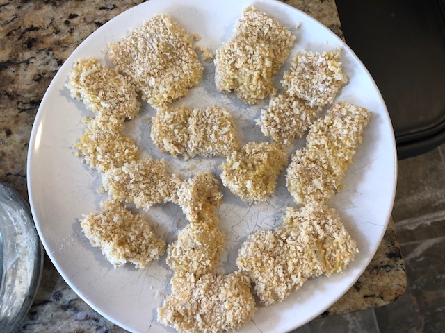 I pulled out all the pieces from that bag earlier and tossed them in the flour, and then the egg wash, and finally the bread crumbs.