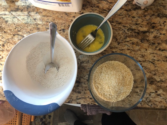 I started by getting my dredges set up. They include AP flour mixed with some spices, then an egg wash, and then Panko Bread Crumbs.