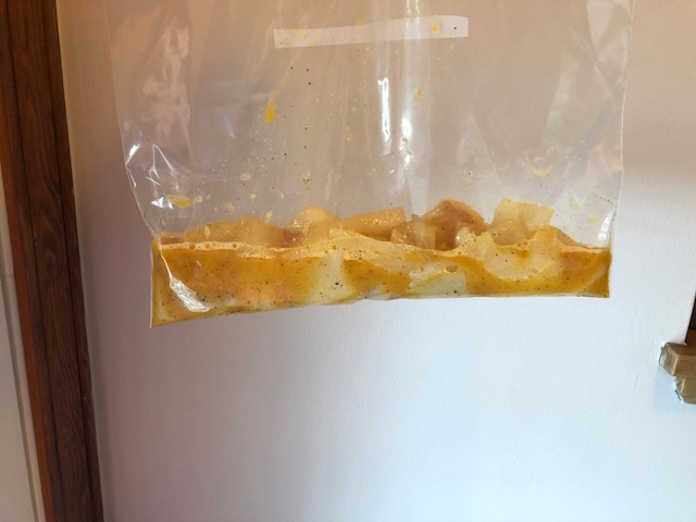 With the other filet, I put the pieces into a plastic bag with some olive oil, beaten egg, and spices. Got as much air out of the bag as I could and left it to marinate in the fridge. You'll see later what happened with that filet :)