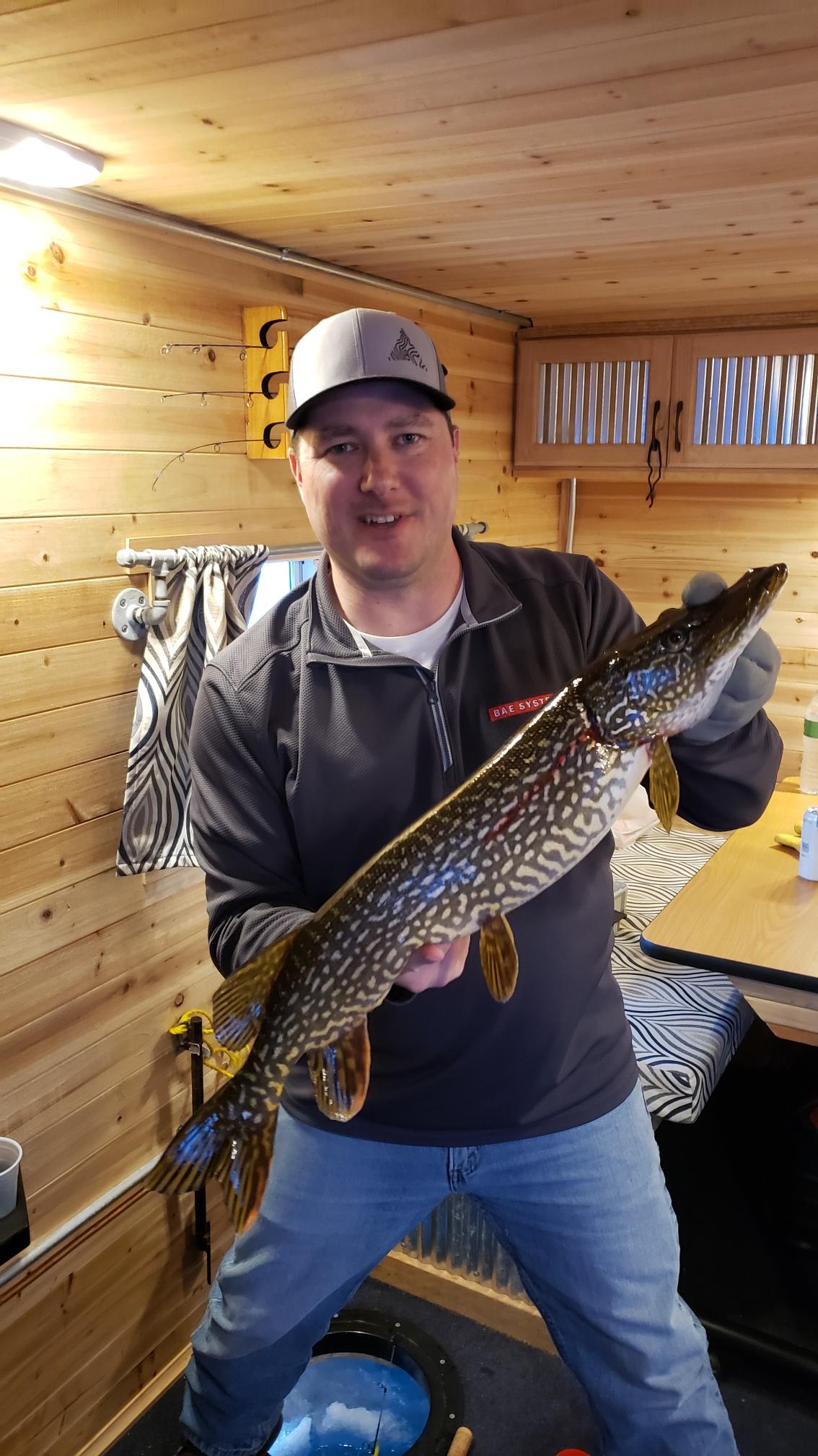 In case you are unaware of what Northern Pike is, here is my buddy Brian who caught this one the other day while out on the ice house with the same brother that gave me these filets. Nice catch Brian!