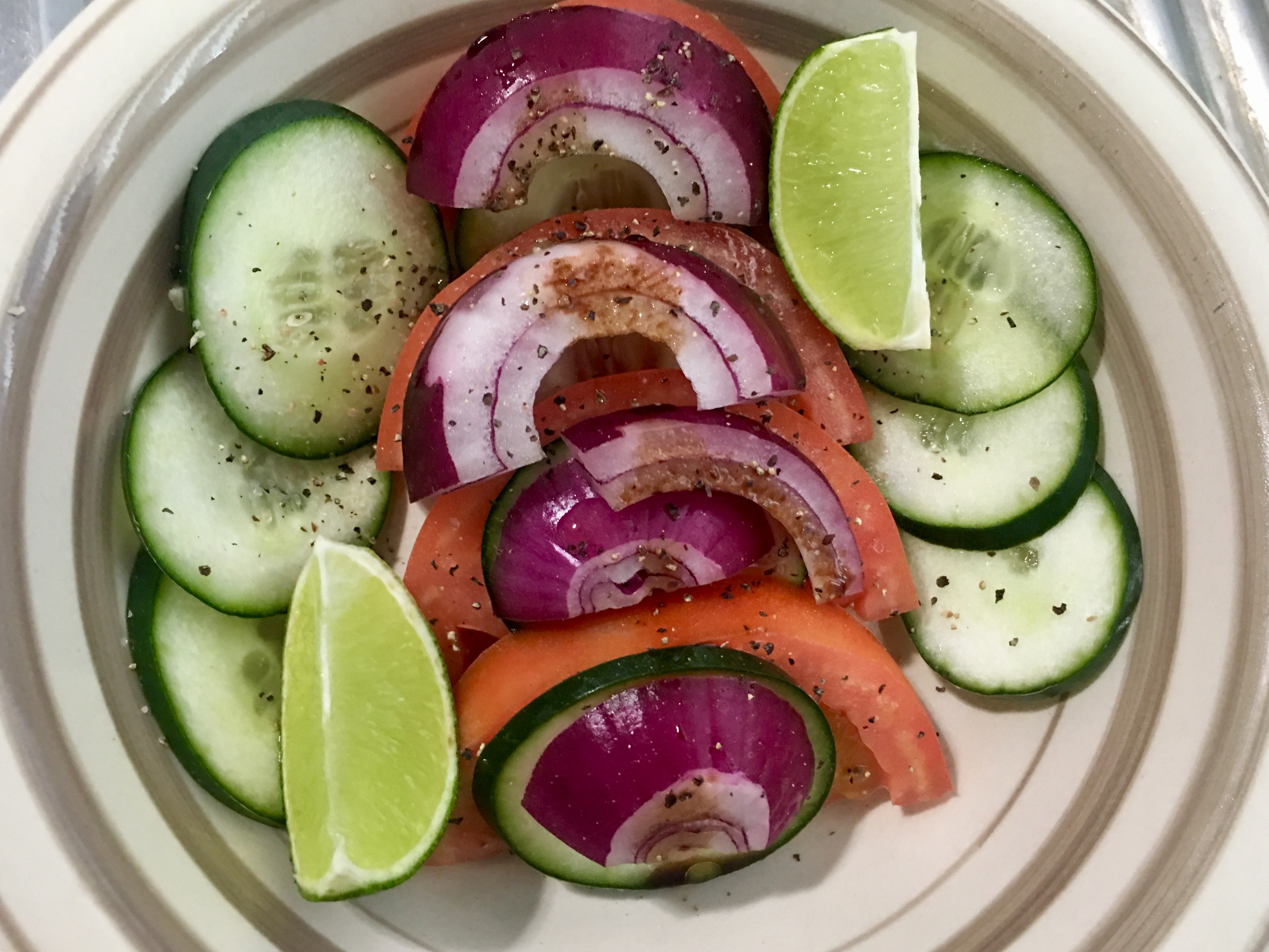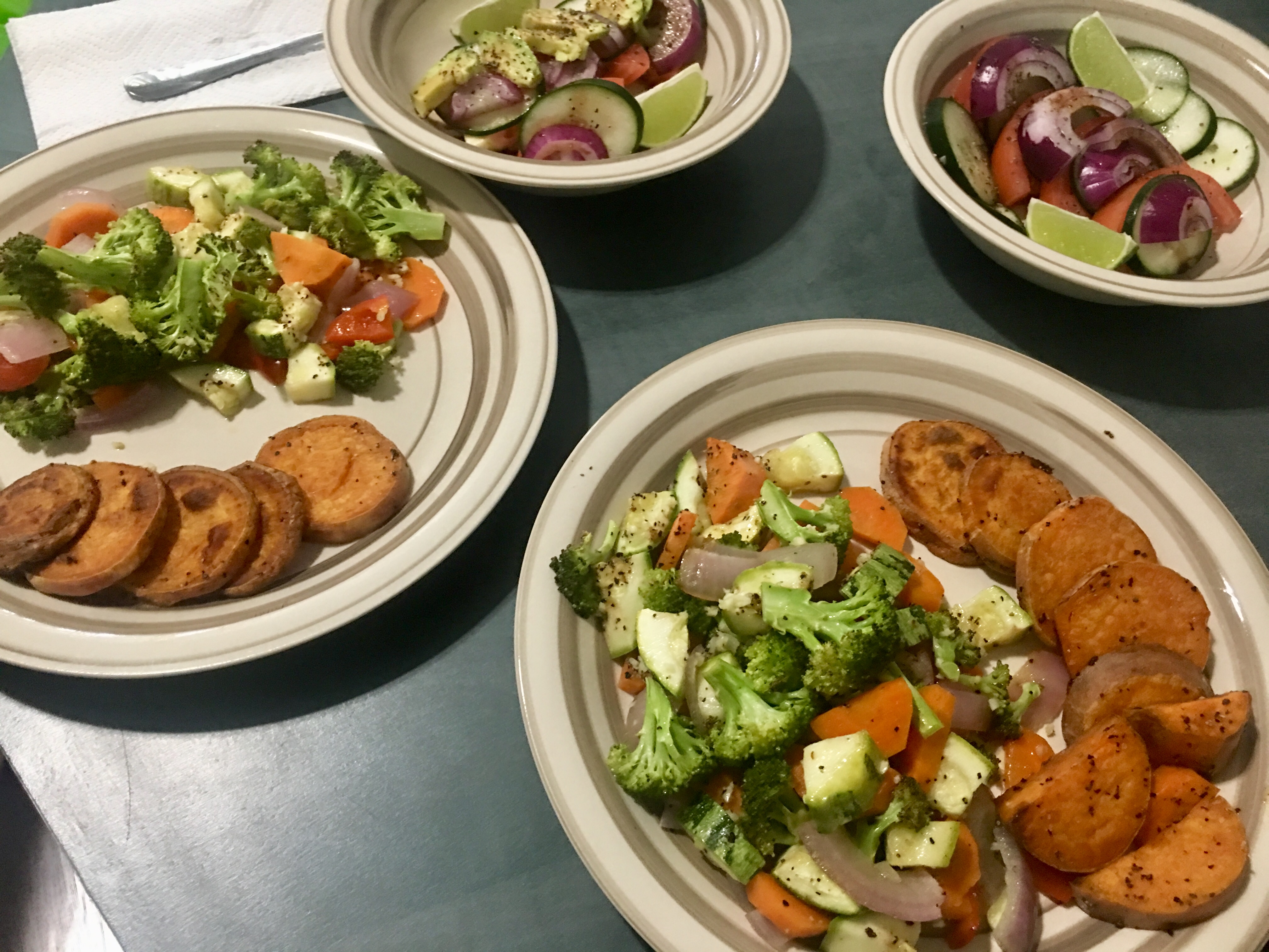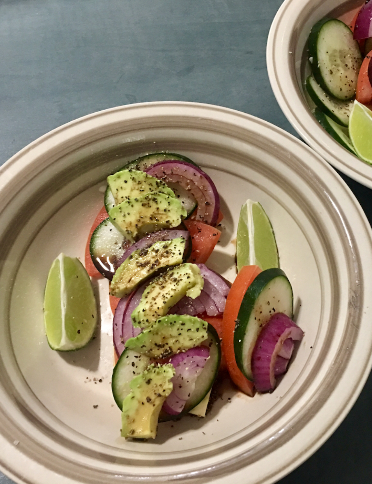 While the veggies cooked I prepared a vegan caprese. Okay, okay, it’s a salad made with tomato, thinly sliced cucumbers, red onion, and mine had avocado, so not a caprese at all but it was close 😉…