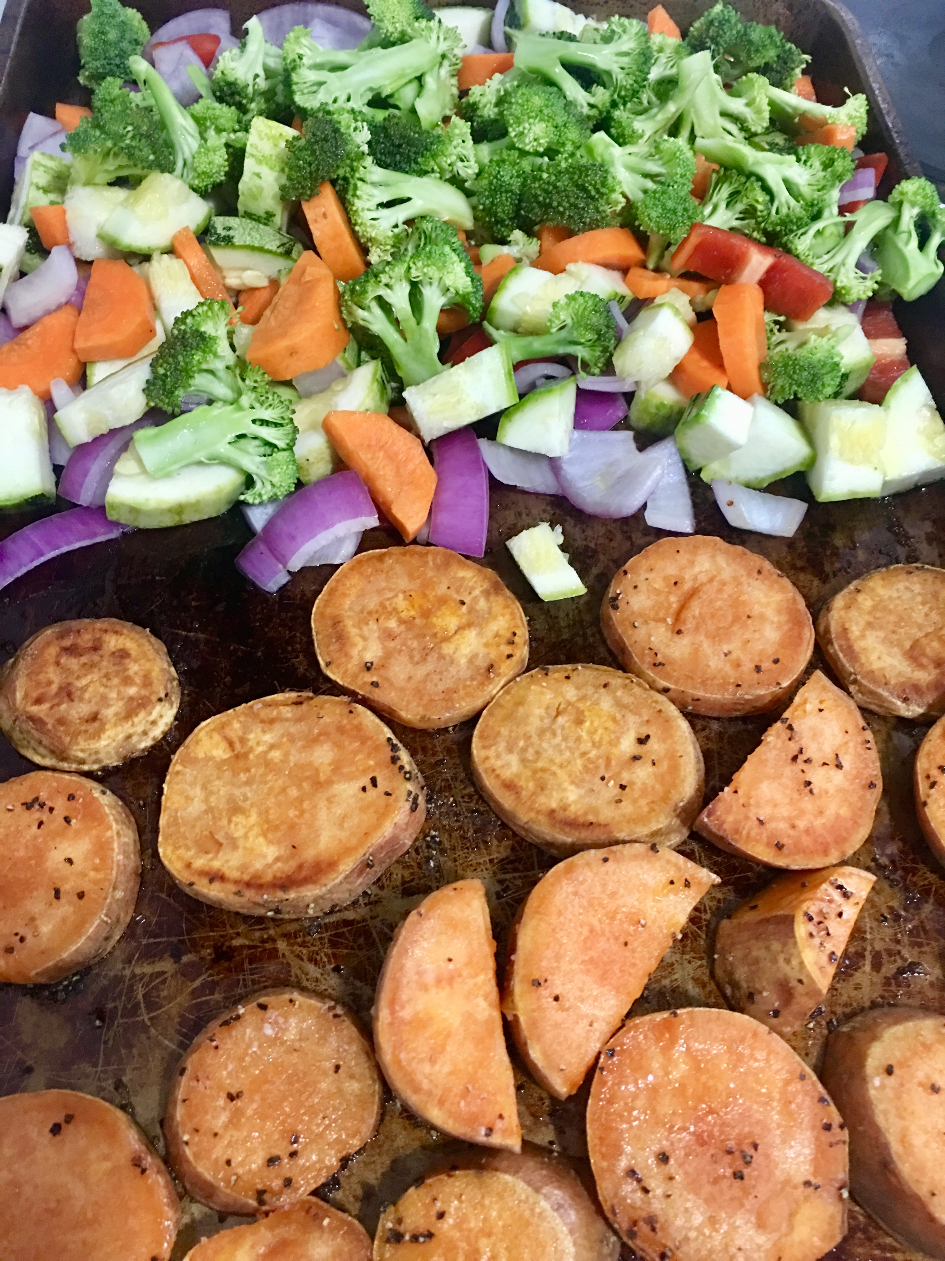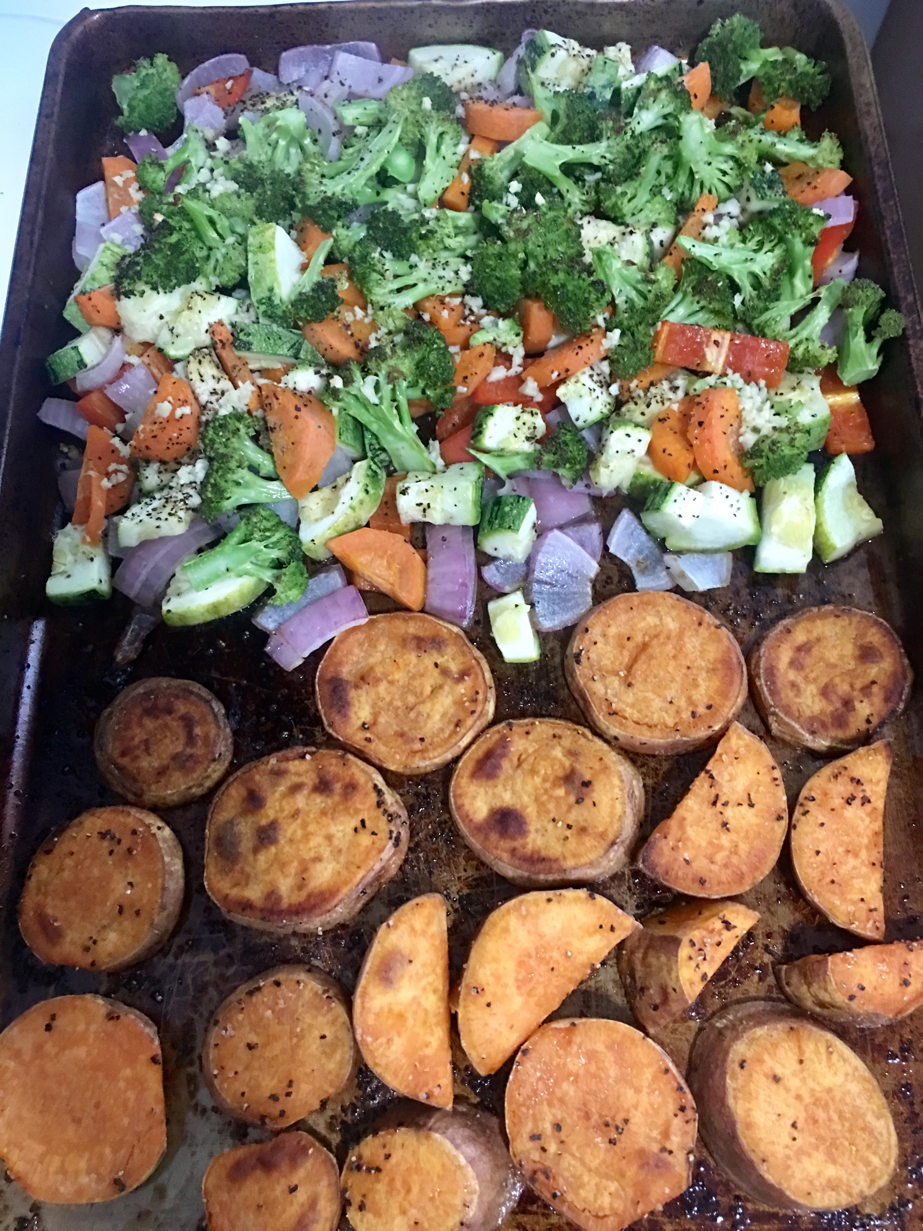 Shoot… now the veggies are about ready. While we were going over my made up words and practicing the pronunciation aloud I went ahead and dusted the roasting vegetables with some freshly minced garlic. Yum 😋…