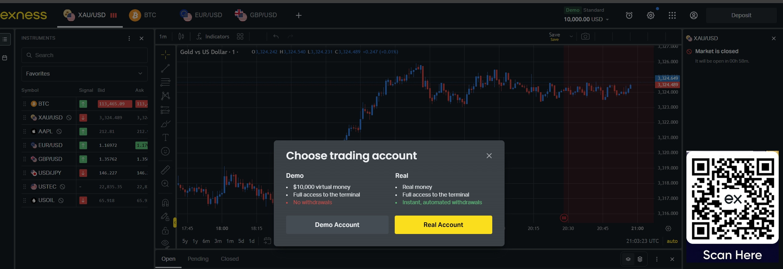 If you're new to forex or just new to Exness specifically, opening a demo account first is almost always the smarter move. You'll trade with virtual funds in a live market environment — same charts, same execution, no financial risk. It's the best way to learn the platform, test strategies, and build the kind of confidence that actually holds up under pressure.