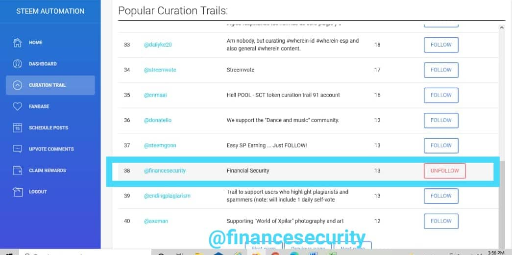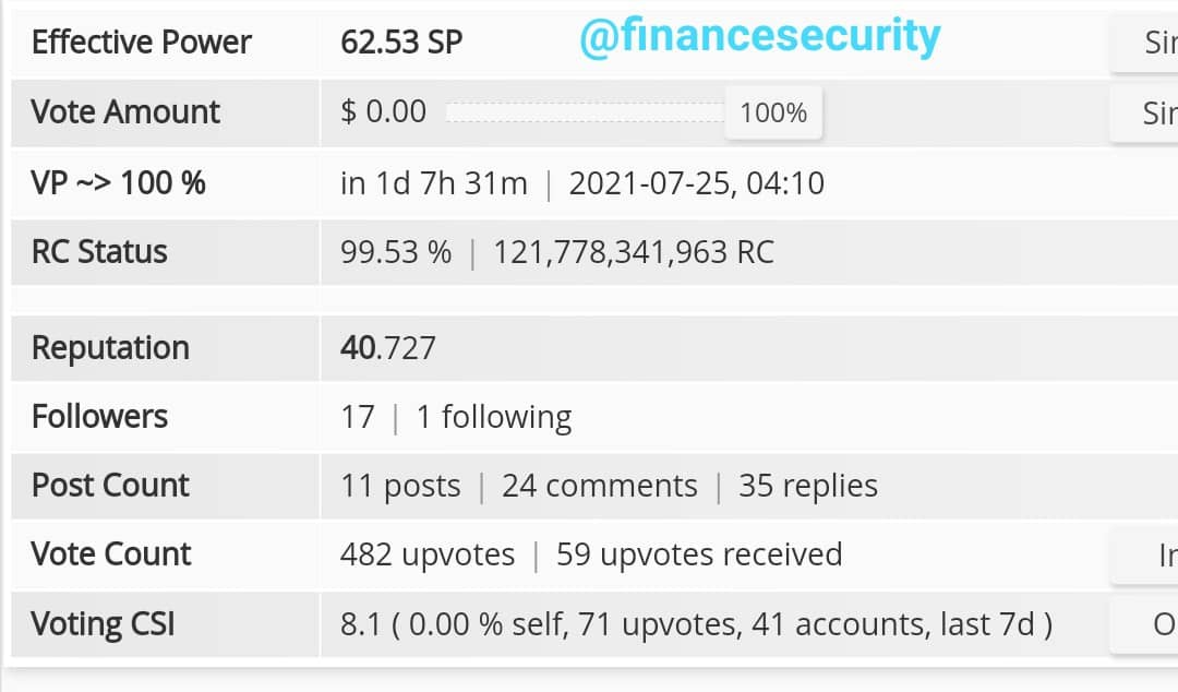 @financesecurity is the community account which also doubles as the community curation account with an individual Effective Steem power of 62SP and a community curation value of 25,869.95SP. We are currently using the wordofxpilar curation trail account with 13 followers and voting manner of about $0.30. For now, only the Admin has the exclusive right to vote using the curation account.