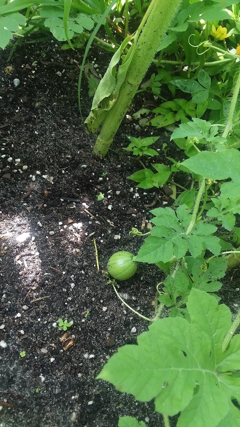Ohhhh, and I LOVE watermelon so I planted a row of those, and this is the first one that is big enough to catch on camera without a macro lens haha! It is about the size of a quarter and is a sweet melon, although I can't tell which kind, it might have a yellow or red center, I planted several different kinds wayyyy to close together... oops!