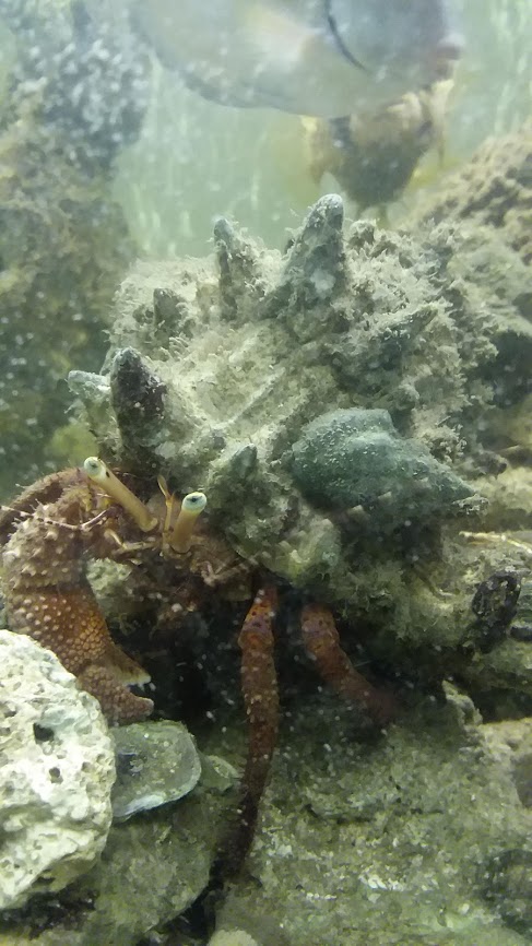 This is a Blue Eyed Hermit crab, and I bet you will never guess why!? Ha, I caught him in a cast net and he has a broken claw so I decided to take him home and add him to the 75 gallon tank I set up.