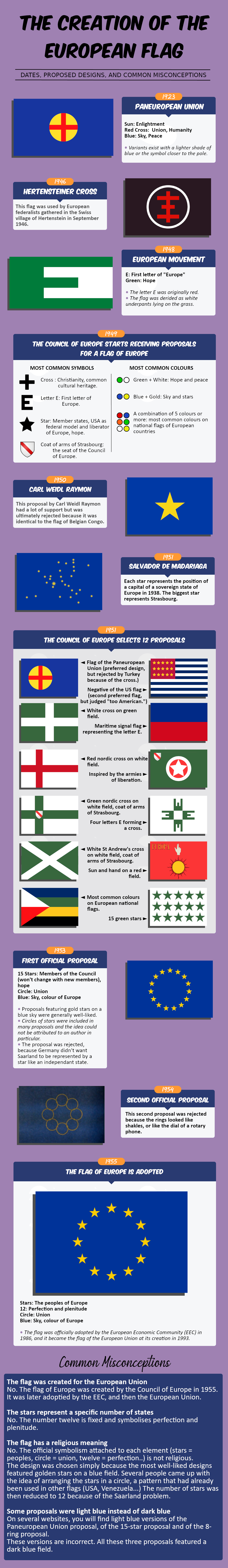 A quality infographic design here that features information about the evolution of the European flag including dates, proposed designs and common misconceptions. The timeline starts in 1923 with the Paneuropean Union flag and goes all the way through to 1955 when the flag of Europe was adopted.