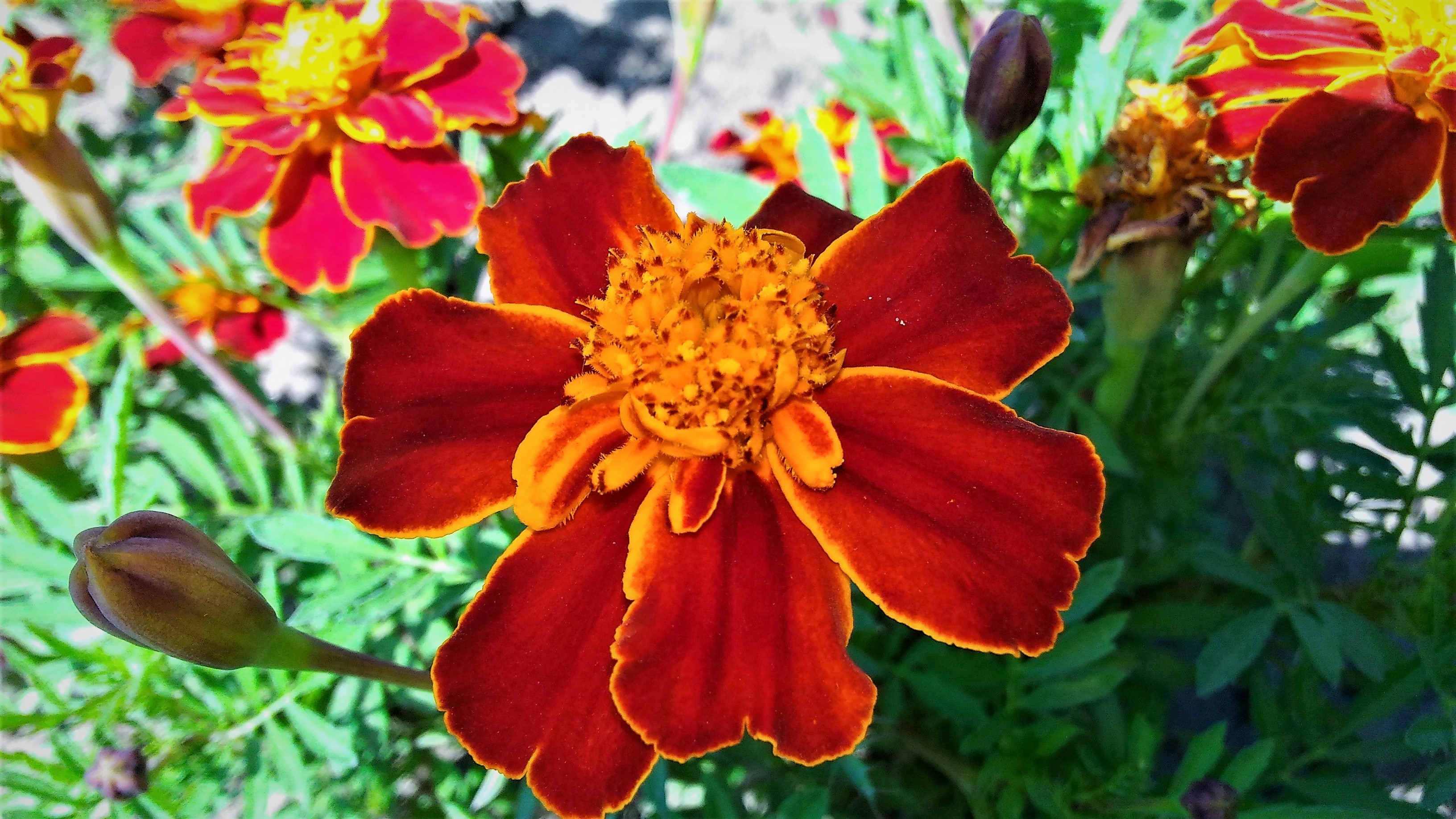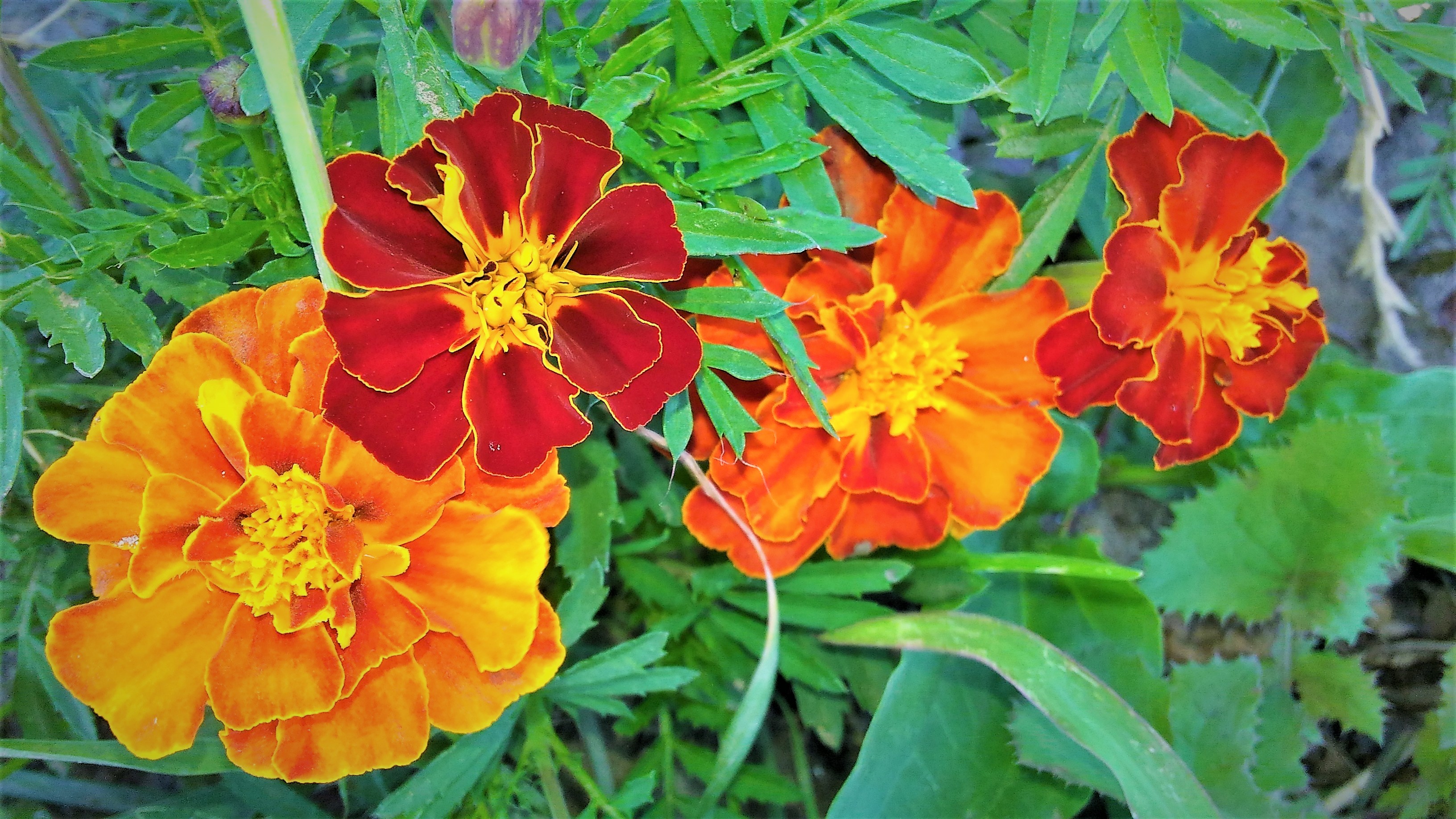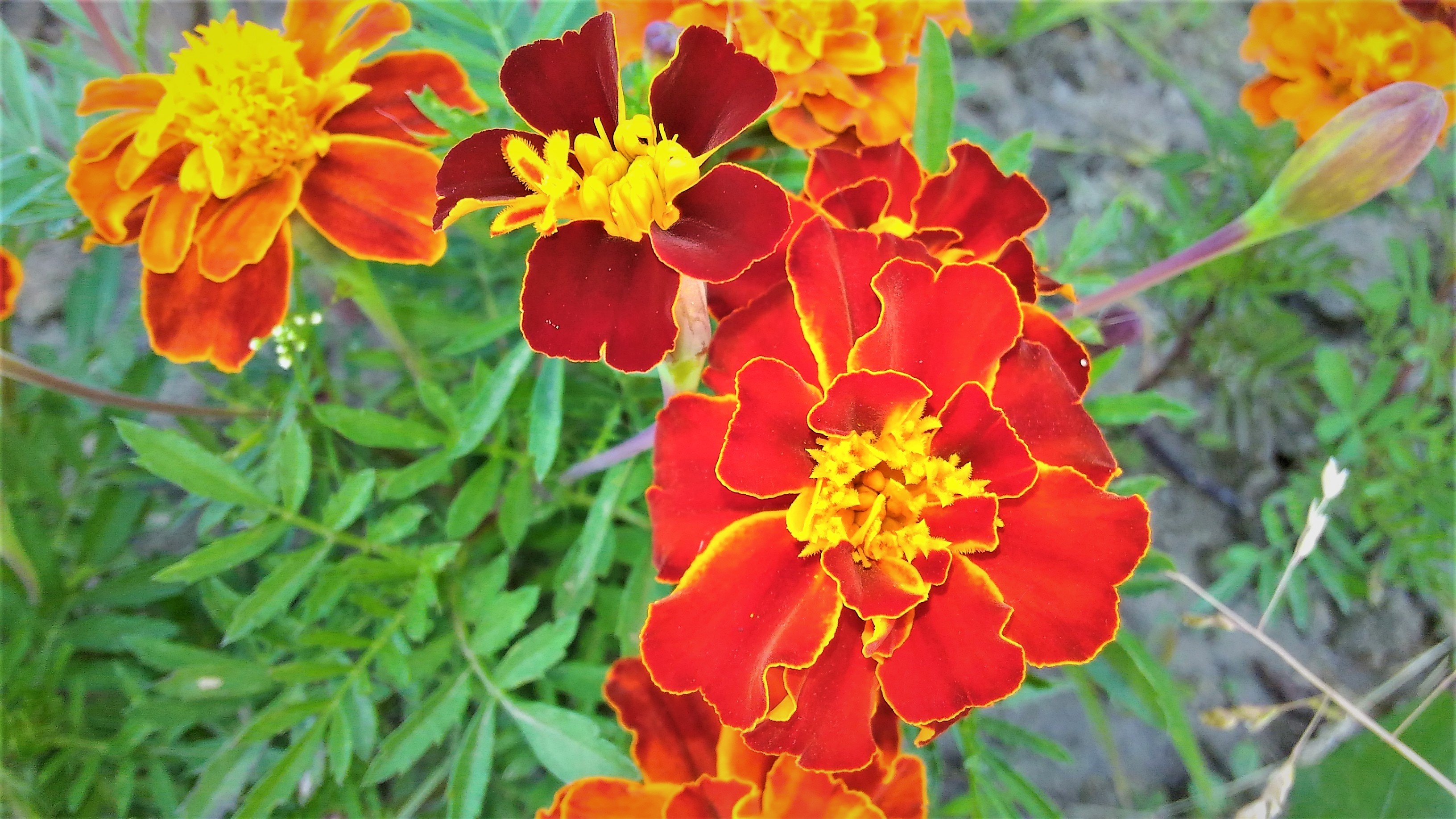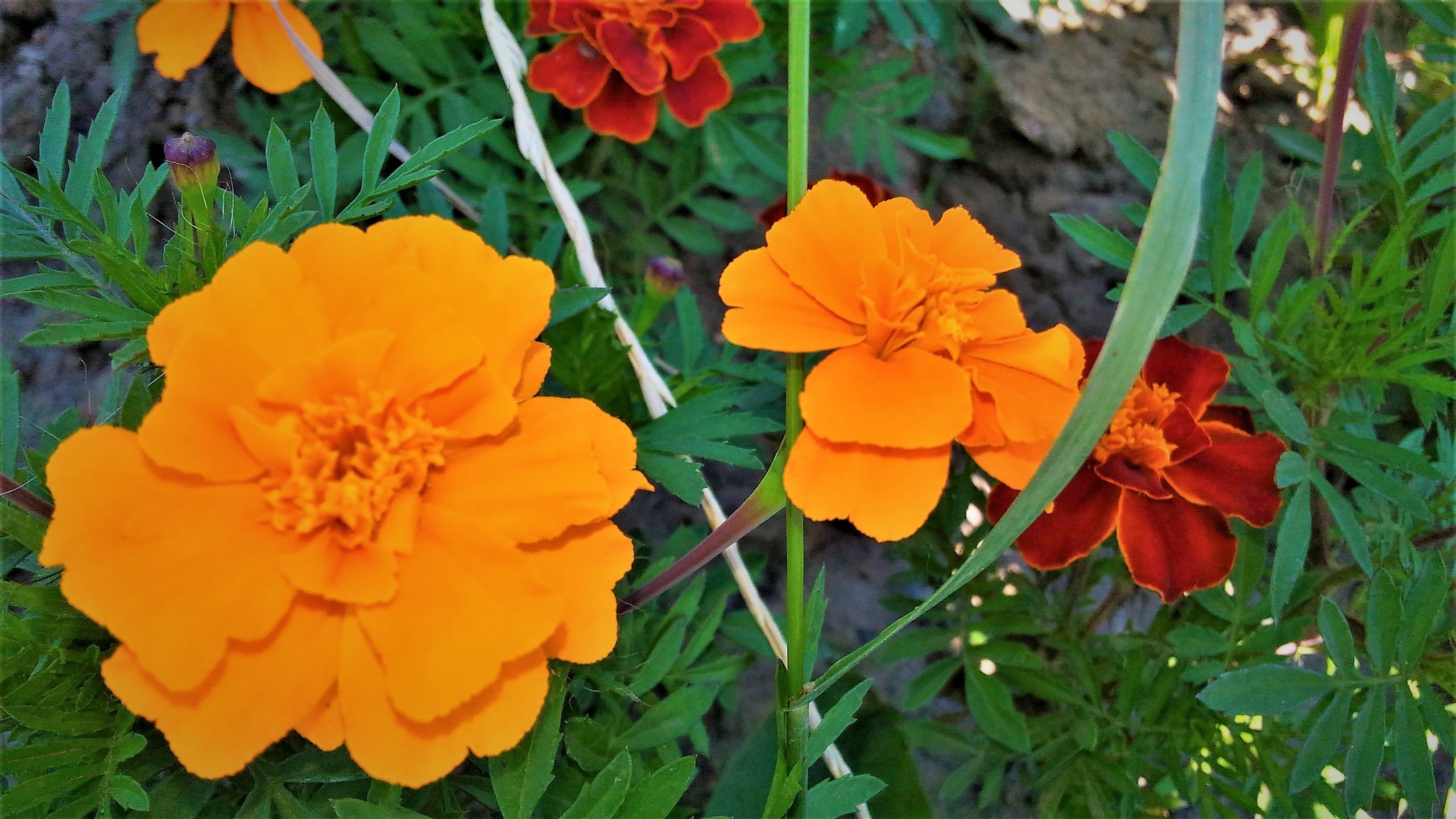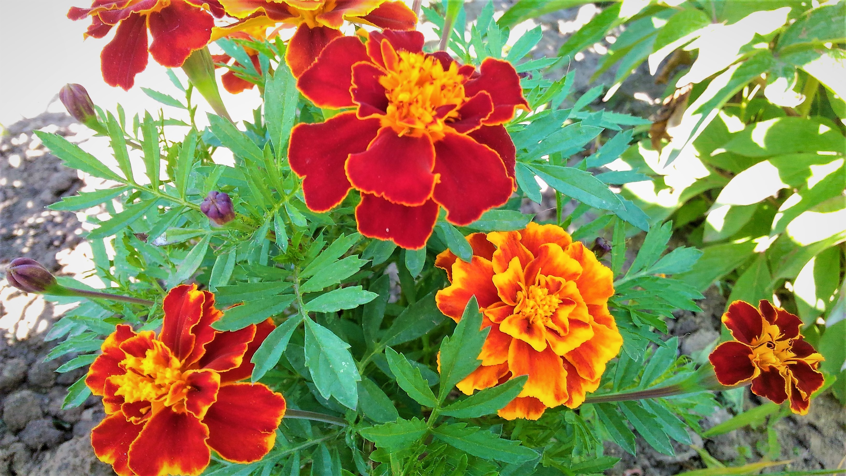 У нас выращиваются бархатцы двух видов. Желтые с крупными цветами. И такие как на фото мелкоцветные. Но зато какие они красивые. Яркая оранжевая окраска в сочетании с красным притягивает взгляд, поднимает настроение. Кроме эстетического удовольствия бархатцы еще полезны для здоровья. Они обладают противомикробными действиями. В качестве целебного сырья используют цветочные корзинки.