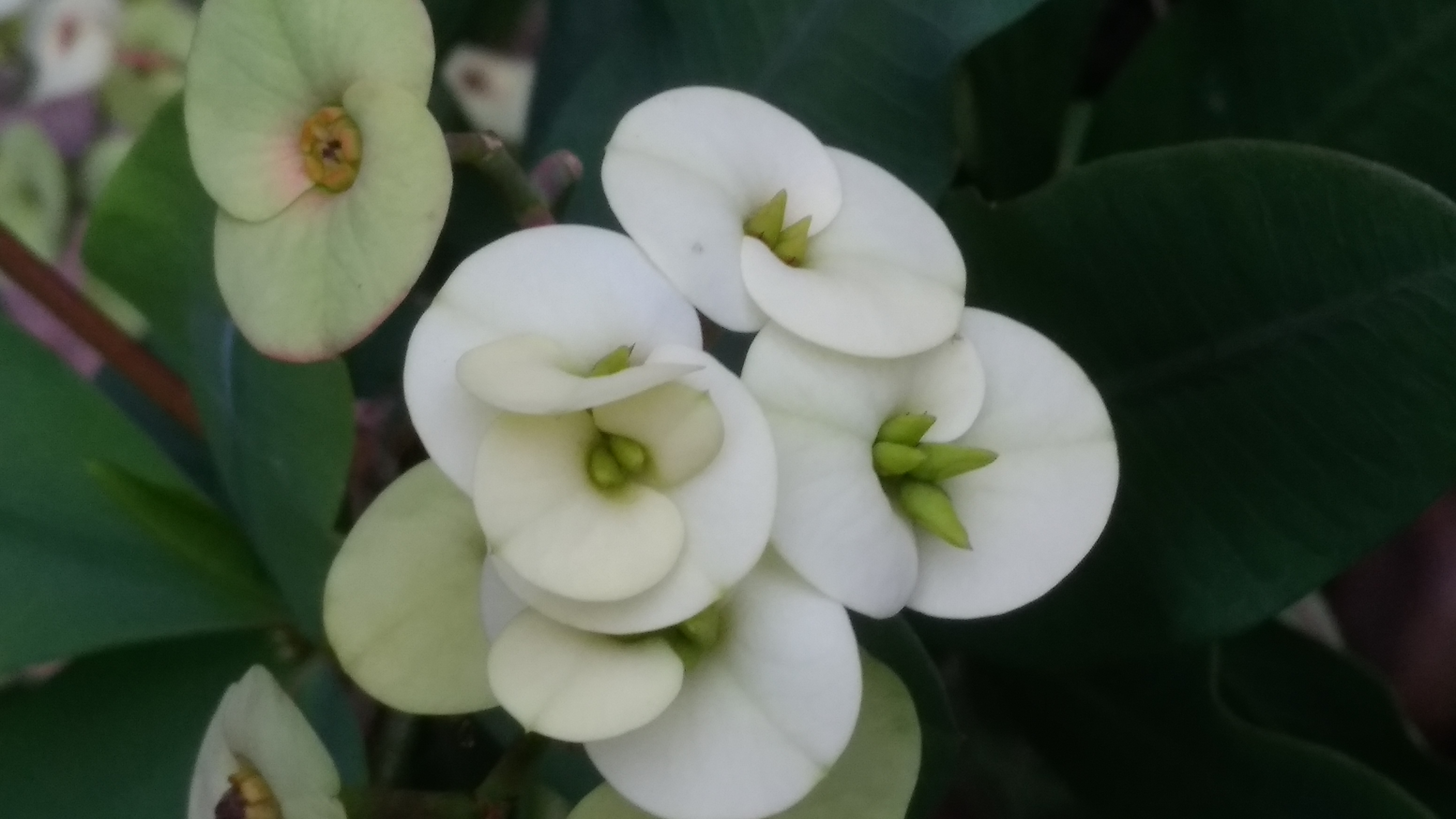Selamat pagi sobat semua, pagi hari ini saya menikmati bunga yang memiliki duri-duri kecil yang sangat tajam. Duri-duri kecil ini memenuhi semua batangnya. Bunga ini adalah bunga Euphorbia dengan warna yang menarik putih kekuningan.