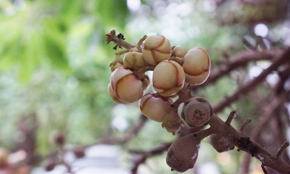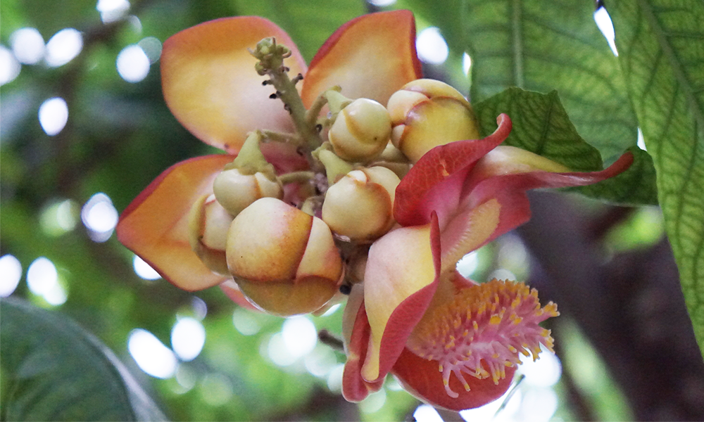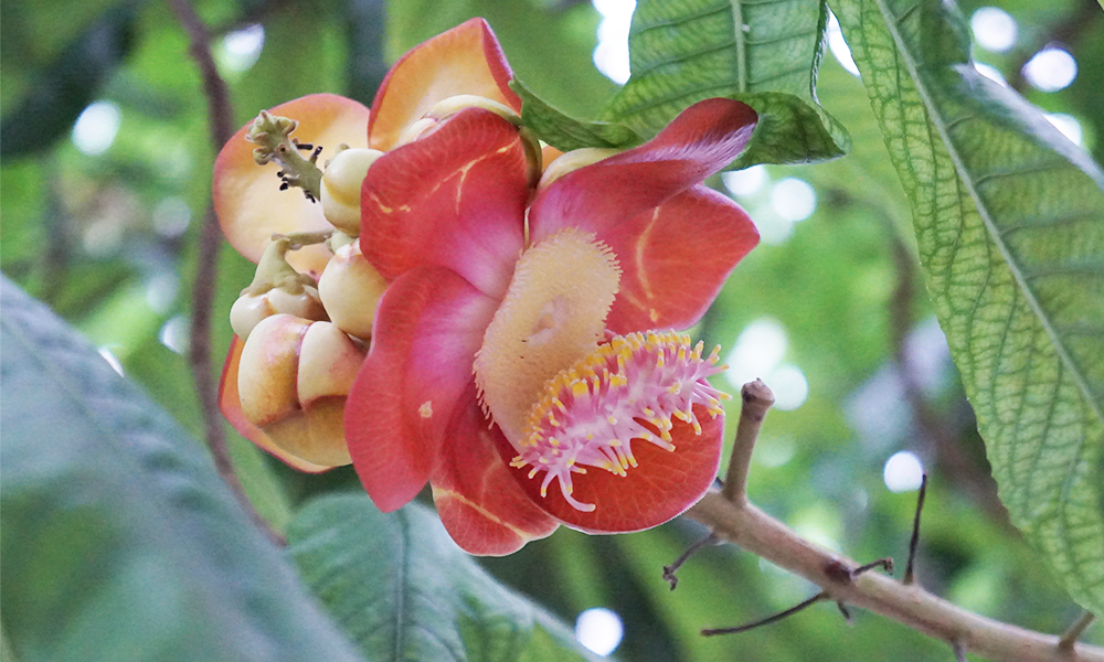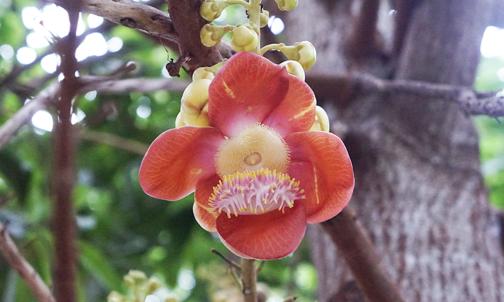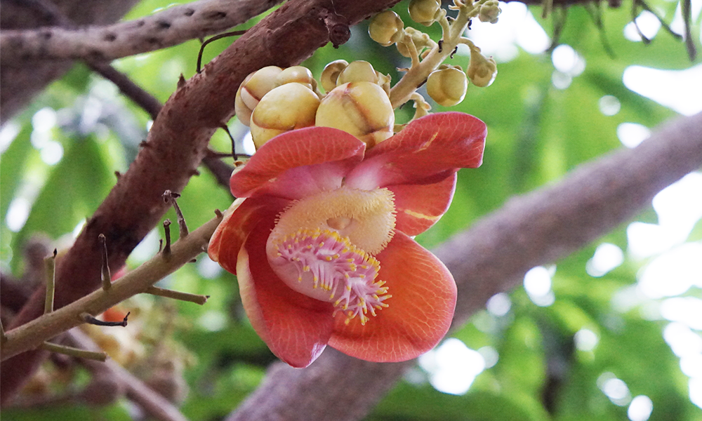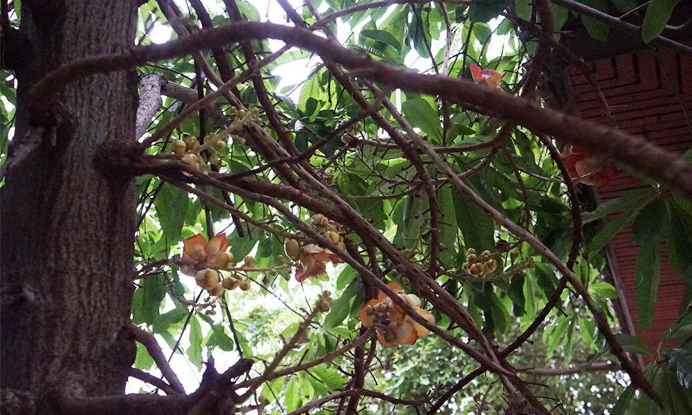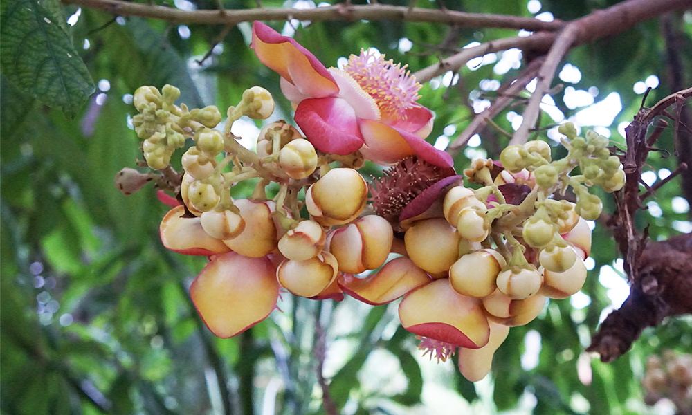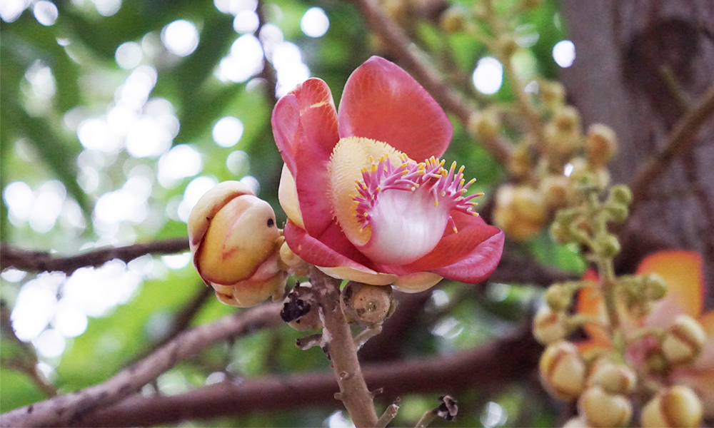 He told that this tree is name " SALA " It usually grows in the tropics. It has a trunk size of about 0.5 meters. It has green leaves and pink flower.