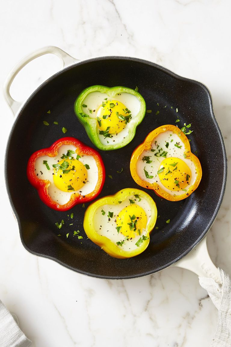 Sunny side up eggs look even yummier framed in colorful bell pepper rings.