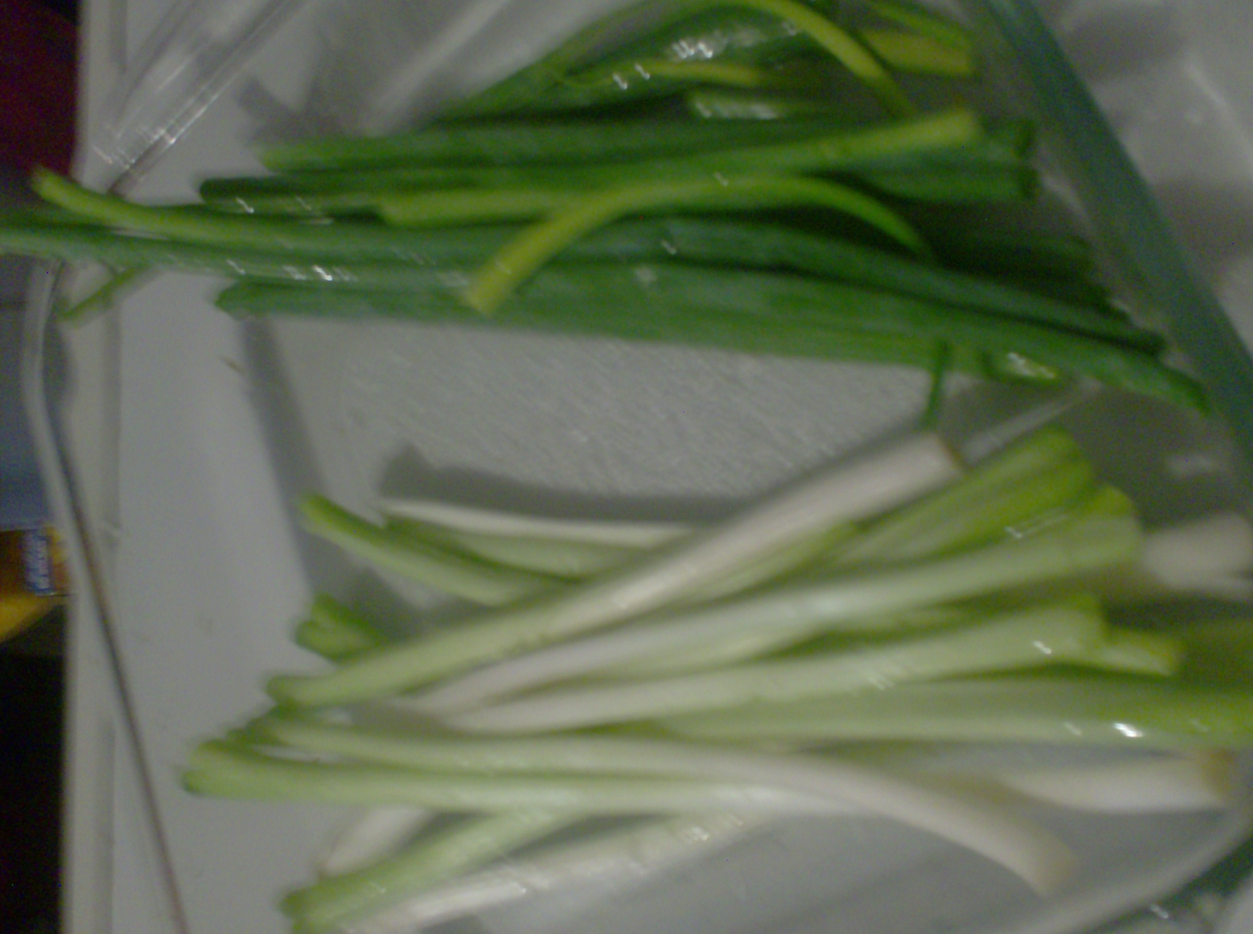 Cortar en julianas el repollo; el cebollín corta la parte verde de arriba en trozos pequeños, es la que se usa, el tallo blanco de abajo no la emplearemos en esta receta, pero la puedes reservar para un tips que menciono en la parte abajo.