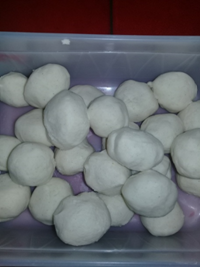 Divide the dough into 20 more or less equal portions and form balls. They are covered with a damp cloth to keep them cool.