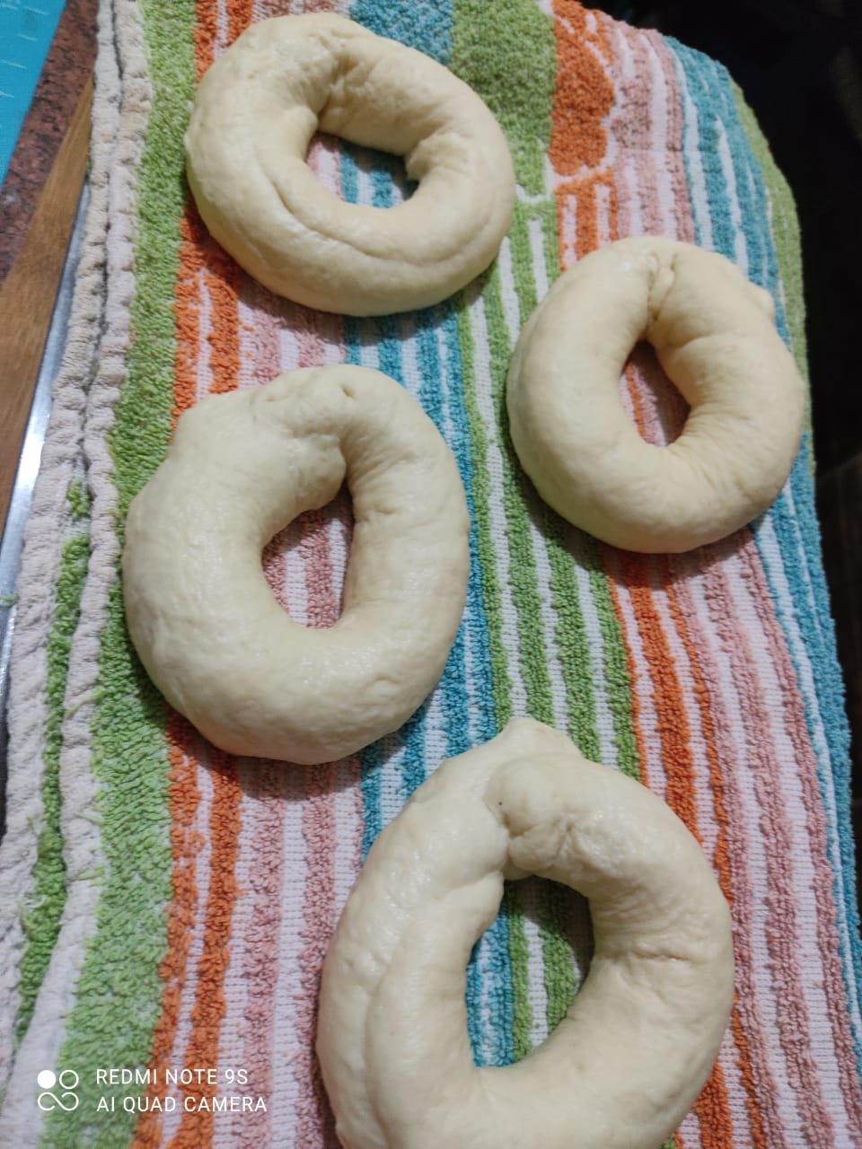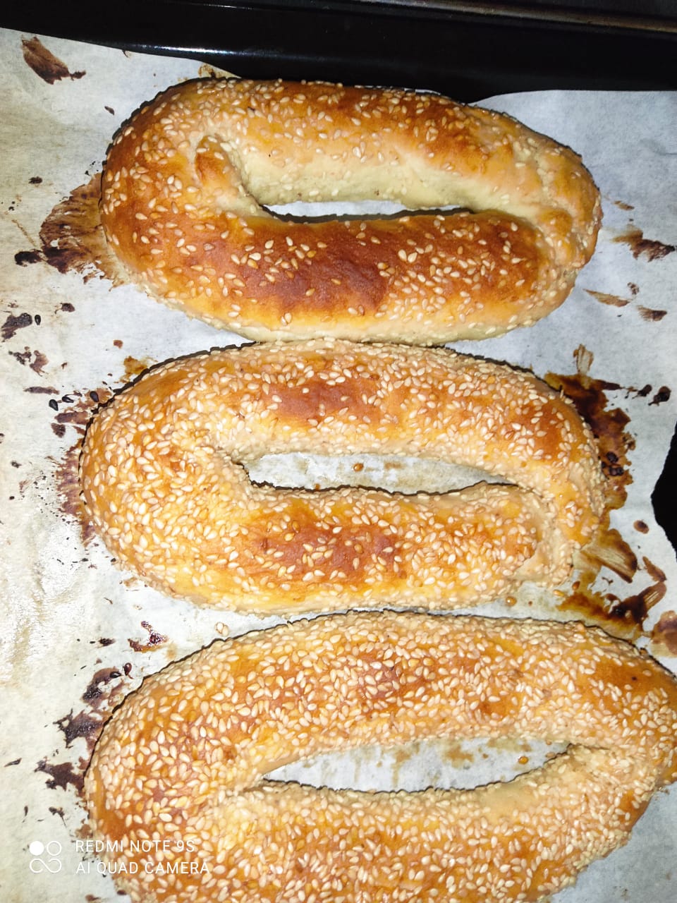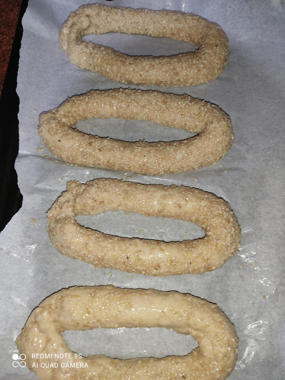 ومن ثم نقوم بتحريكهم كل المكونات مع بعض وترك الخليط وتغطيته ليتم تخميره لمدة ربع ساعة ومن ثم نقوم بعد التخمير بأخذه وبوعاء آخر نضع حوالي أربعة أكواب من الدقيق معيارية وعليهم معلقة من البيكنج بودر ومعلقة كبيرة من المحلب المحمص المطحون ونحركهم ونضعهم على خليط الخميرة ونقوم بعجنهم واذا احتاجت دقيق نضع عليها لنأخذ عجينة لينة وجميلة ونعجنهم بالعجان ونتركهم يخمروا ونشكلهم دوائر ونغمرهم في السمسم ونخبزهم ونرش الماء عليهم رشة بسيطة ونخبزهم ونغطيهم بعد الخروج من الفرن ليكونوا طريين وحلوين