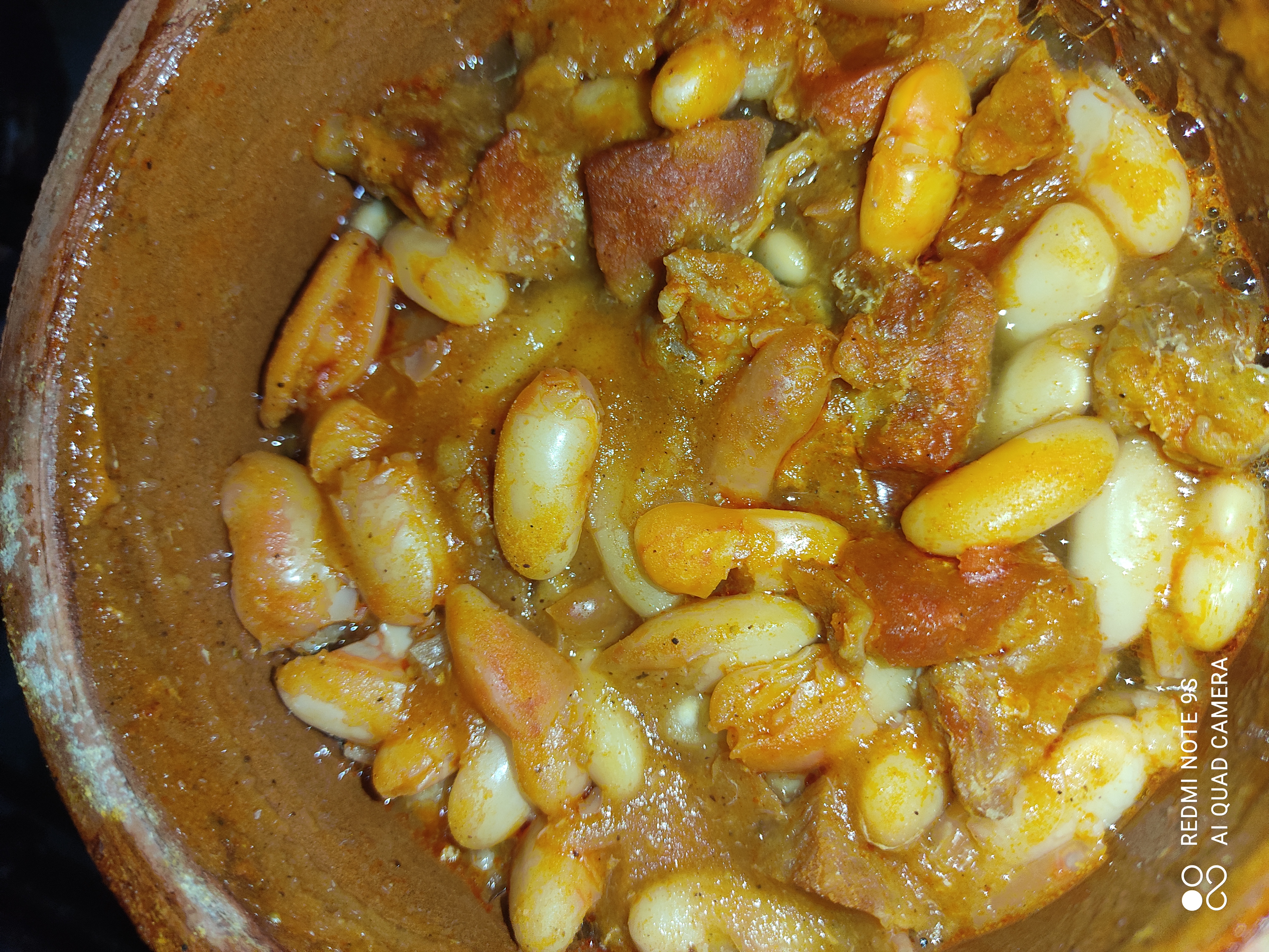 وبعد ما تكون استوت معنا اللحمة وظبطنا البهارات اللازمة نقوم بتصفية الفاصوليا وغسلها من ماء السلق ووضعها في الطاجن فوق اللحمة وتخليها على النار حوالي خمسة دقائق وبنكون عملنا الطشة تبعتها وهي عبارة عن تومة مهروسة مع زيت أو أي نوع مادة دهنية ونحمرها التومة ونضعها فوق الطاجن ونحركها مع بعض وهي بتكون جهزت بنسكبها بالأطباق وتقدم بجانب الأرز