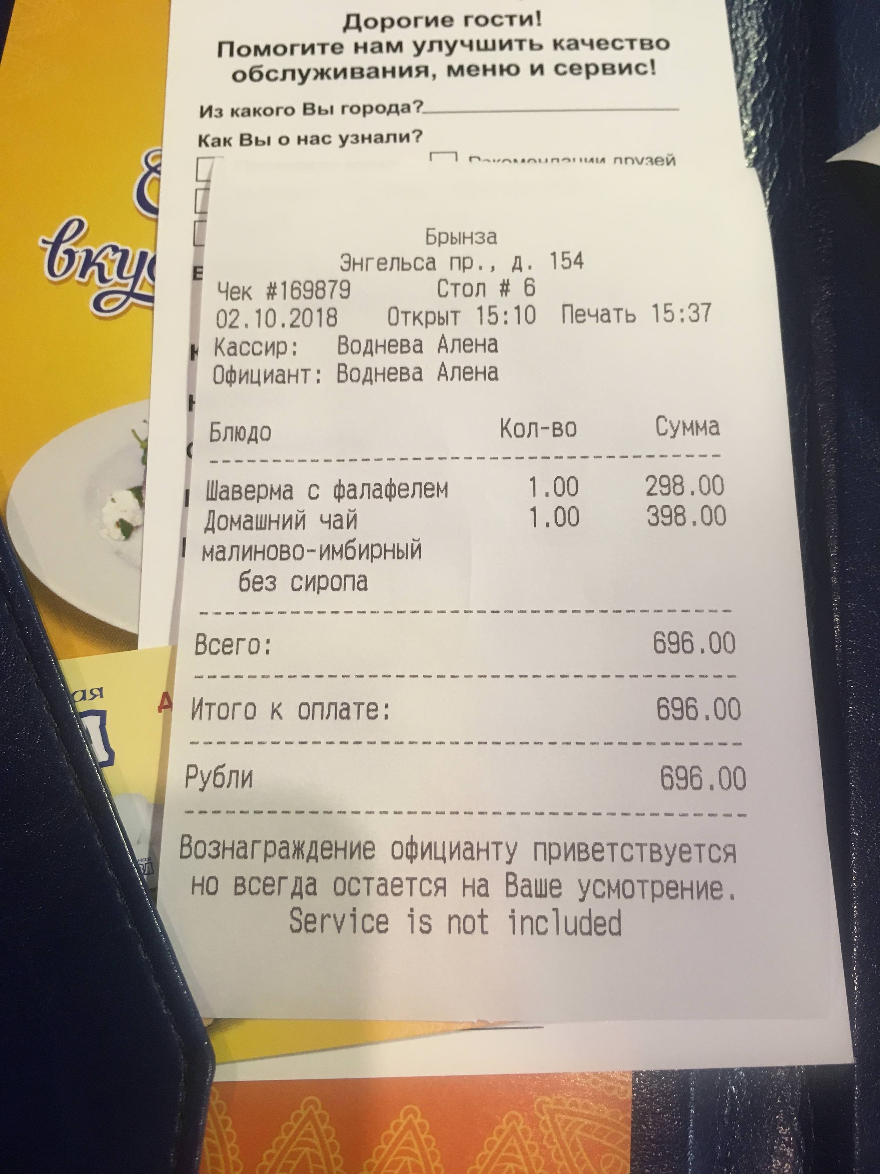 Поела я хорошо, а вот момент офигевания настал, когда я попросила счёт. Некогда хорошая своей бюджетностью «Брынза» по ценнику стремится к недорогому ресторану. А по еде ещё не дотягивает, тем более, что рядом с любой «Брынзой» найдётся простой ресторан с более интересным меню. Либо стрит-фуд с меню того же уровня, но заметно дешевле. Как-то грустно мне стало, видимо, сюда я больше не ходок.