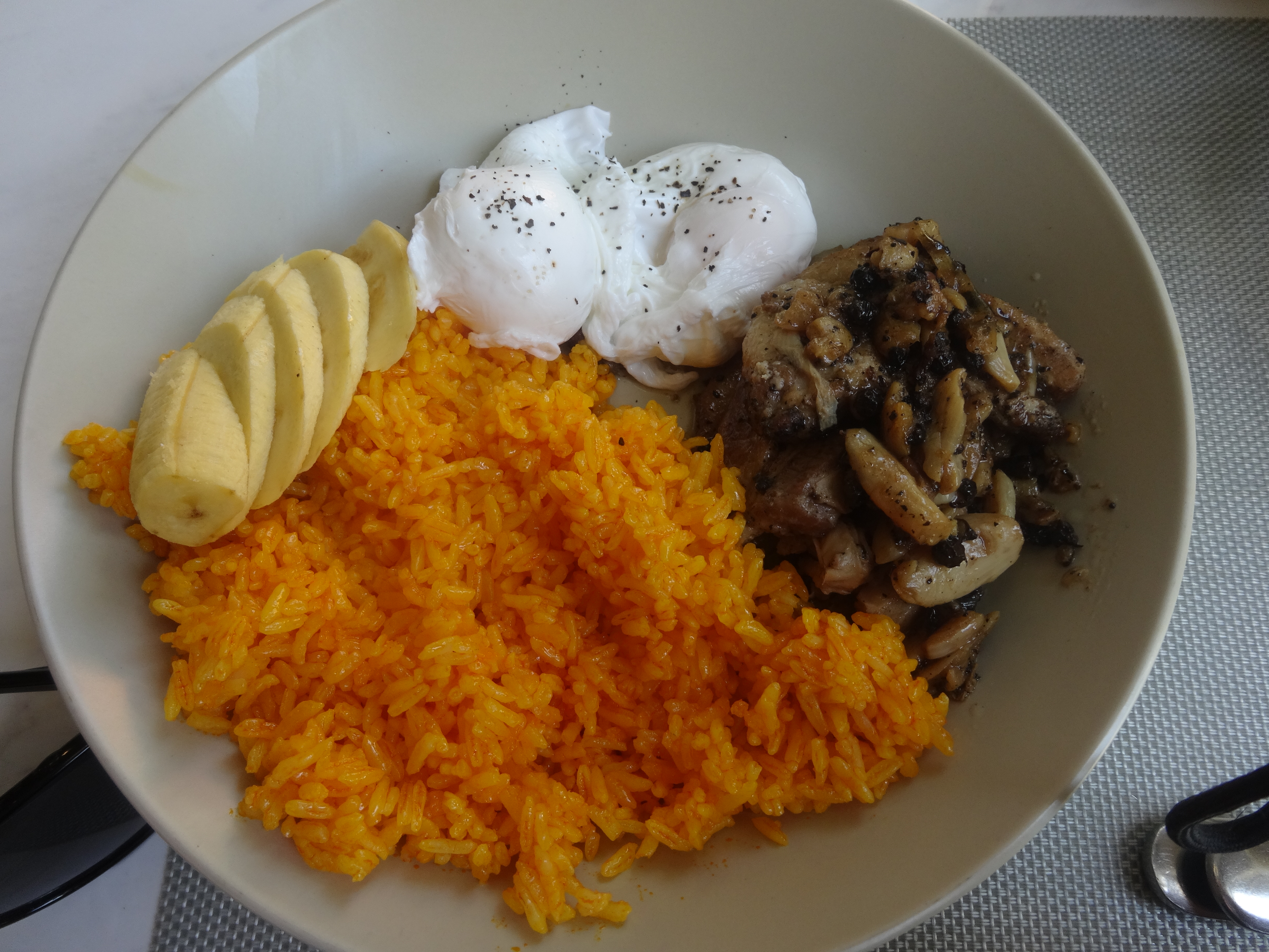 The orange rice is quite mind boggling but those poached eggs do look mighty fine. Perfectly done. Aside from the salty part, I am glad you had a good dish :)