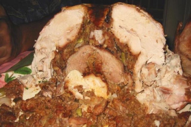 It is a camel stuffed with a lamb stuffed with twenty chickens, twenty pigeons and ten ducks.